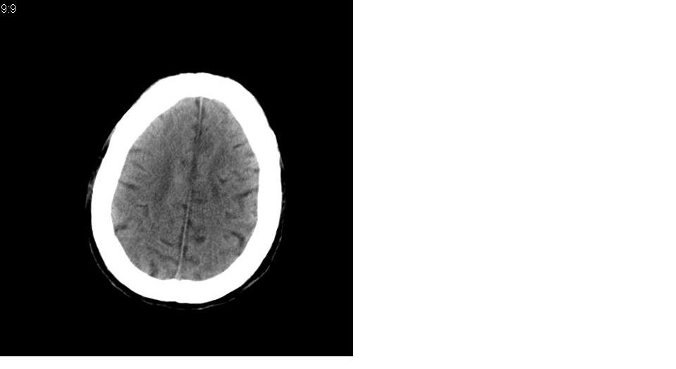 左右侧脑室前后角对称性低密度区,边缘模糊,脑沟,脑池增宽,脑室扩大,左侧基底结区见多个低密度病灶