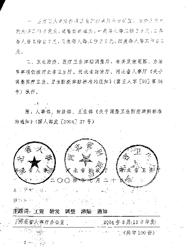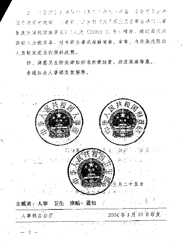 三、对医疗卫生津贴标准国家不再统一调整。各医疗卫生单位可按照中组部、人事部、卫生部《关于深化卫生事业单位人事制度改革的实施意见》(人发[2000]31号)精神,通过深化内部收入分配改革,对专职从事或接触有毒、有害、有传染危险的人员制定适当的倾斜政策。