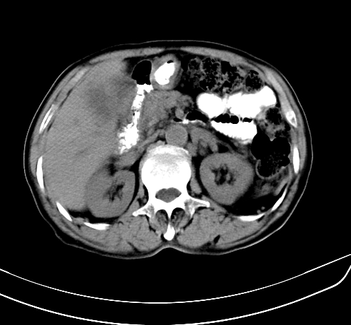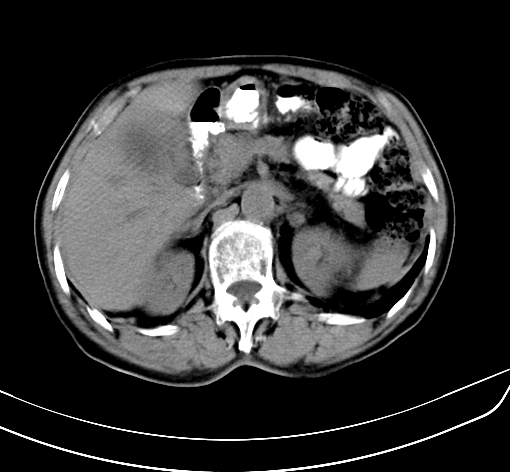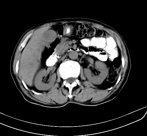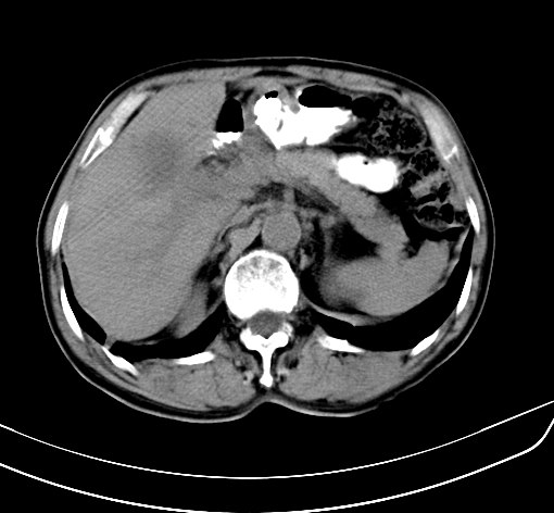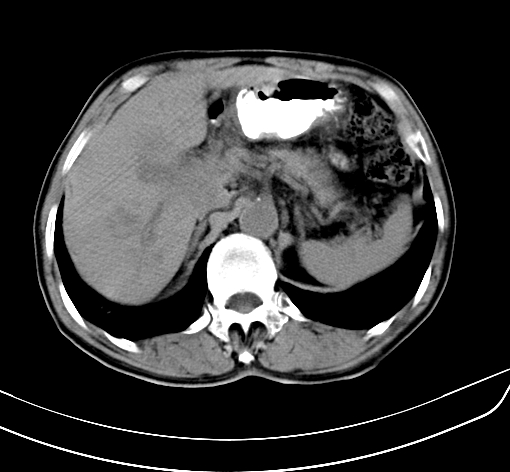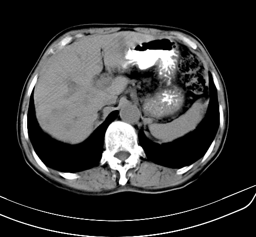 肝脏多发大小不等低密度灶,边界不清,肝门区结构不清,肝内胆管轻度扩张,胆囊密度不均匀,内见软组织样密度影,与相临肝脏边界不清.考虑:1、胆囊ca侵犯肝脏并肝内多发转移,肺上也有结节影,转移?建议强化扫描.2、胃充盈不好,如怀疑有病变最好建议做相关检查.