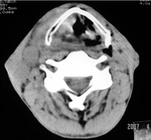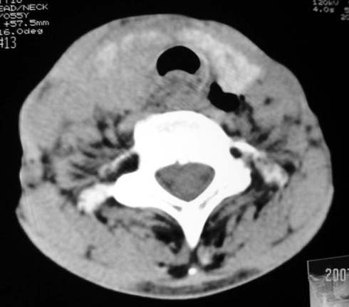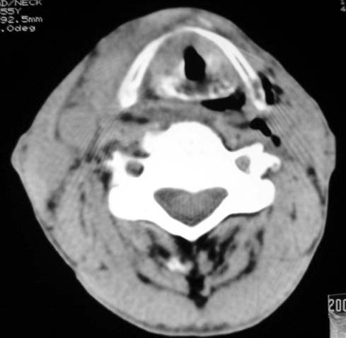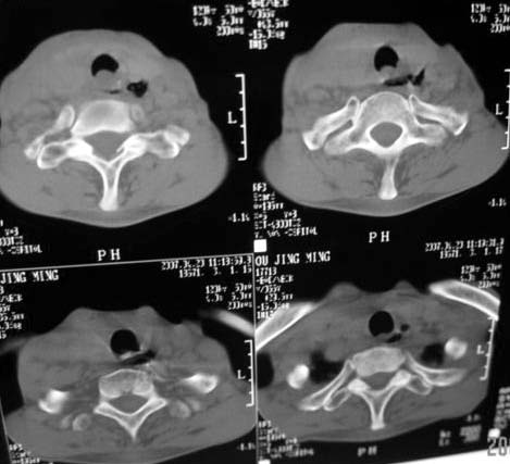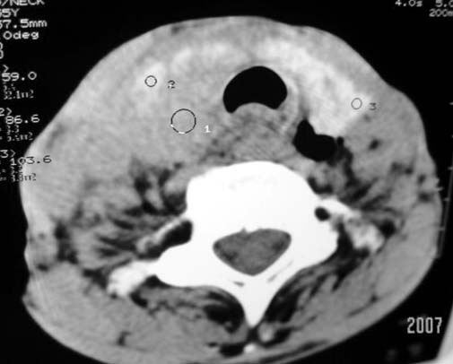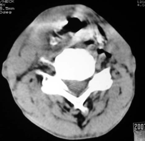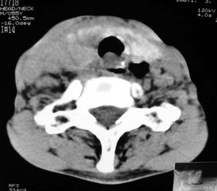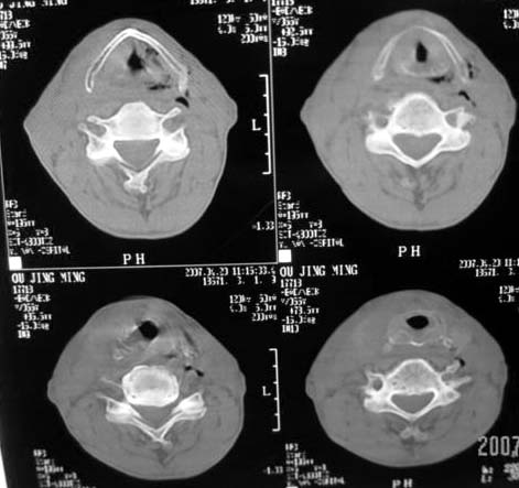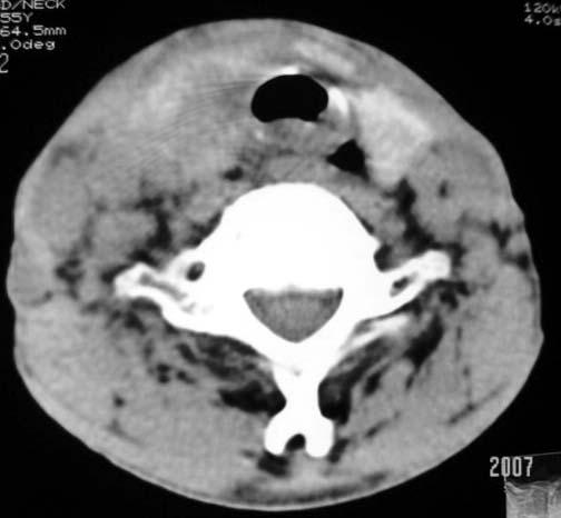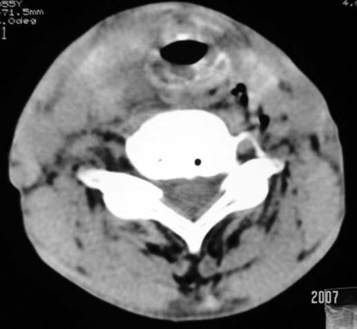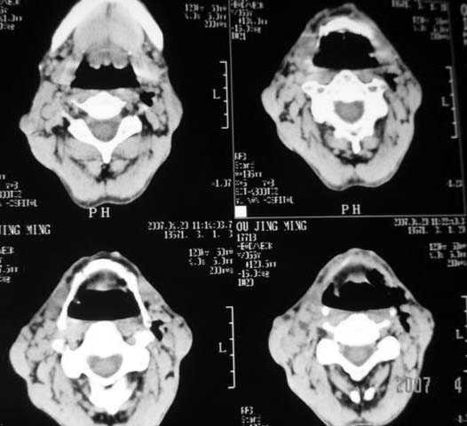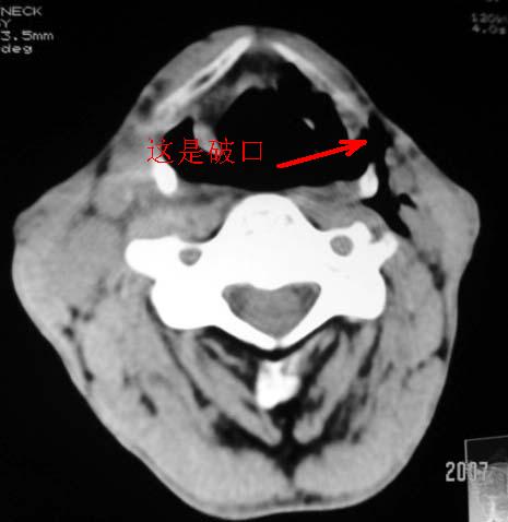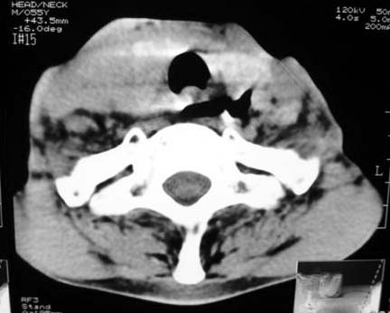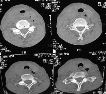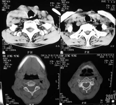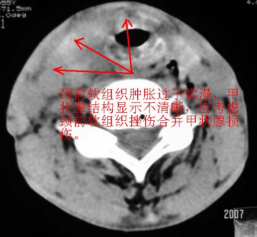 以下是引用dyqct在2007-4-20 16:19:00的发言:[br]考虑:1、左侧梨状窝区破裂伴左颈深、浅部气肿。[br] 2、右侧甲状腺区血肿(请追问病史是否伤及右颈部)。[br] 3、建议病情稳定后增强扫描除外右侧甲状腺腺瘤。