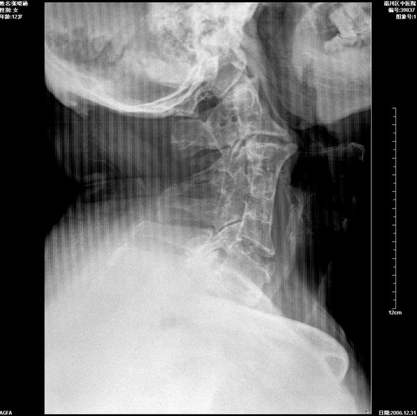 多个椎体融合。少见。颈部的伪影是滤线栅还是毛衣?