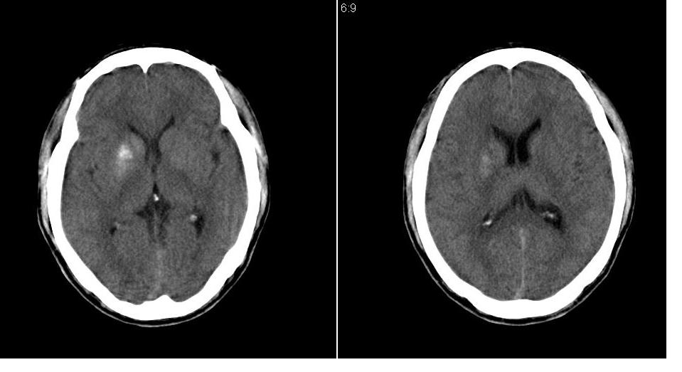 以下是引用tianhep在2007-5-9 19:53:00的发言:[br]这个部位多为苍白球钙化,苍白球钙化往往双侧对称。有外伤史而无症状。首先考虑为苍白球钙化。短期内复查一次就可。
