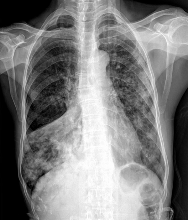 双肺野均可见呈弥漫分布结节状略高密度影,以右下肺及左肺为多,边界不清;于右下肺野内见“倒三角形”高密度区。