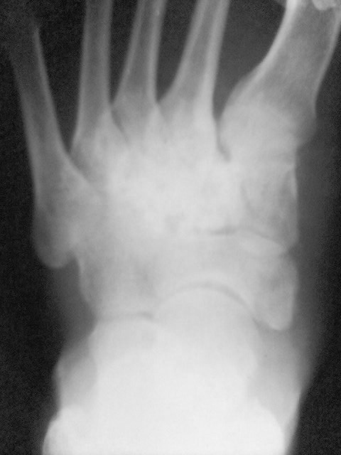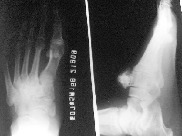 手机拍的 不太清 足背软组织可见局限的多发斑点状及不规则状钙化影 请大家赐教