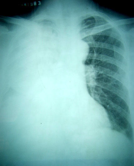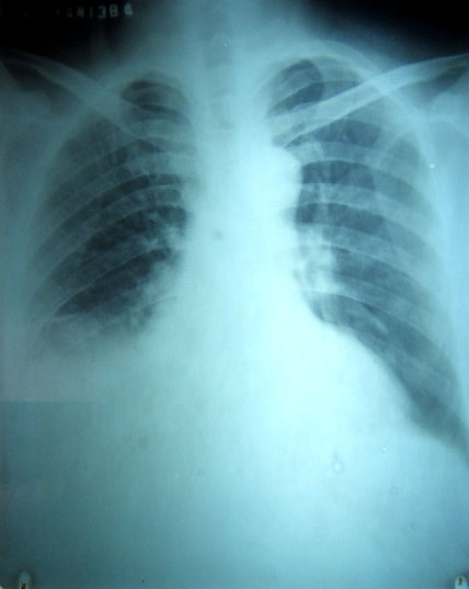 以下是引用software在2007-5-18 19:48:00的发言:[br]患者男,因发热,咳嗽,咳痰半月余而入院,有盗汗,双手会不自主的颤抖。 [br][br]这是第一张片:[br][br]明摆着是胸腔积液,还有胸膜肥厚,入院后行胸穿,抽出淡褐色胸水,生化检查,我只记得糖0.8,其它的不记得了,李凡他(+)。 [br][br]第二天复查胸片,就成这模样了。。。。。 [br]