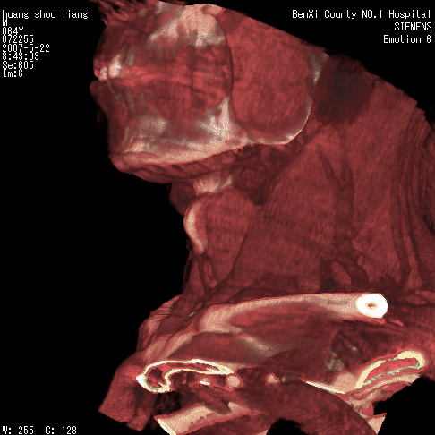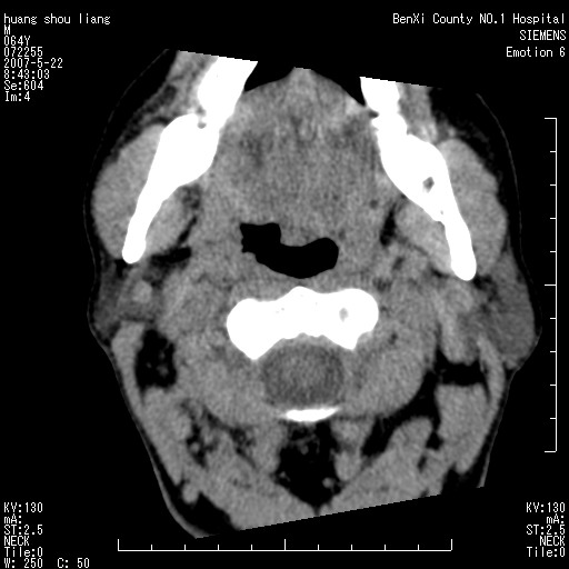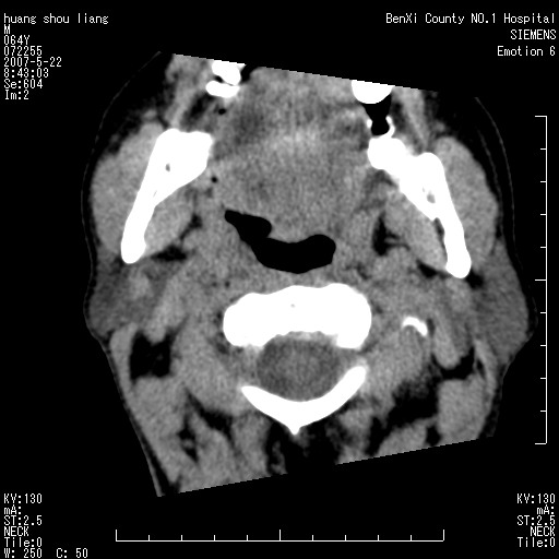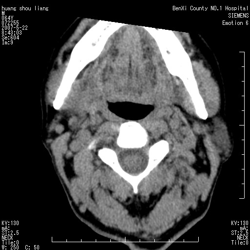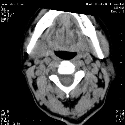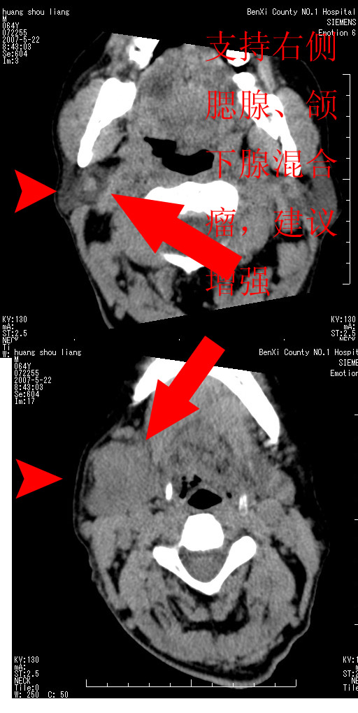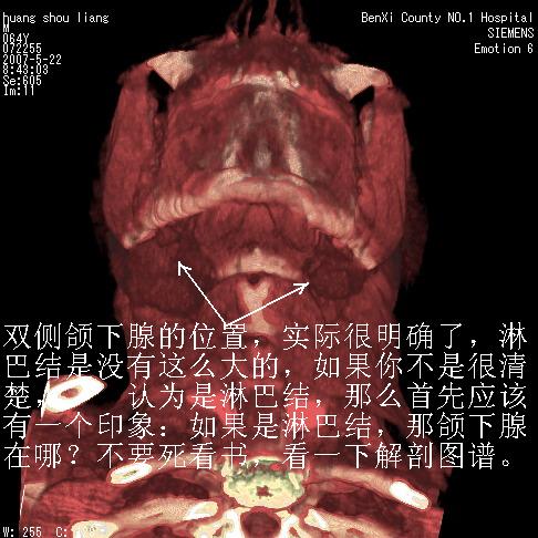 对不起大家,可能是片子发太多有点乱,正常腮腺在下颌角的外侧,颌下腺在下颌体的中部内侧,本例在下颌角内侧偏下,和腺体一点关系都没有,从vrt和mpr上可以很明显看出来,再者肿块是好多粘连在一块的,大家在仔细看看,左侧可能也是吧,我还是考虑为肿大的淋巴结融合在一块,但性质??????