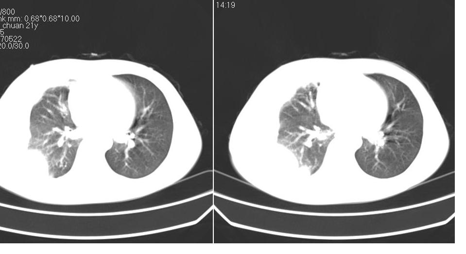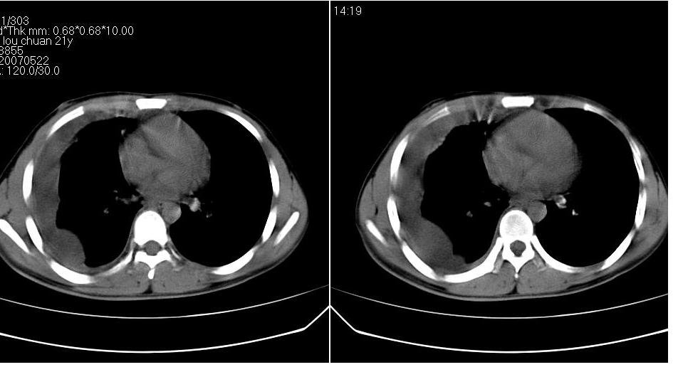 以下是引用天南地北在2007-5-22 18:21:00的发言:[br]右侧包裹性积液(结核性可能大)。