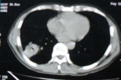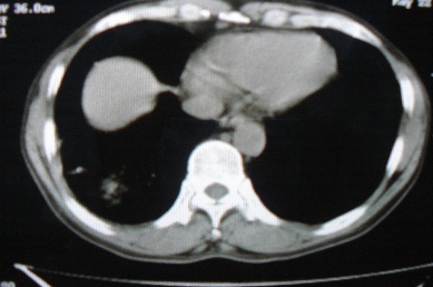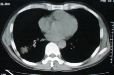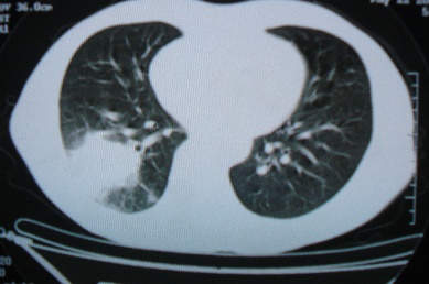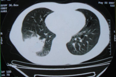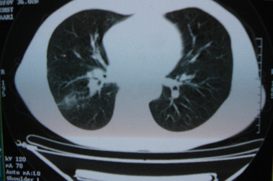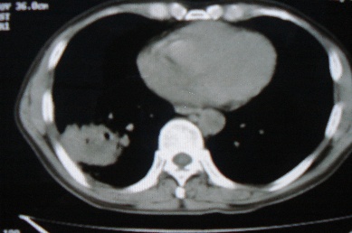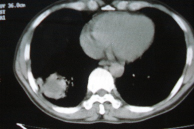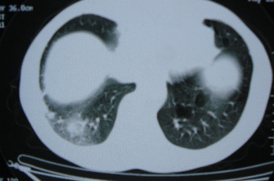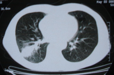 ct10716,男,59岁。发热咳嗽一天,咯血一次入院。