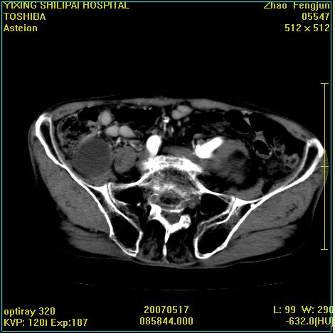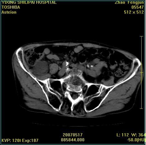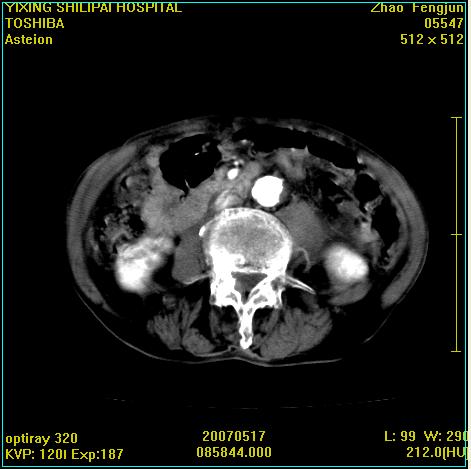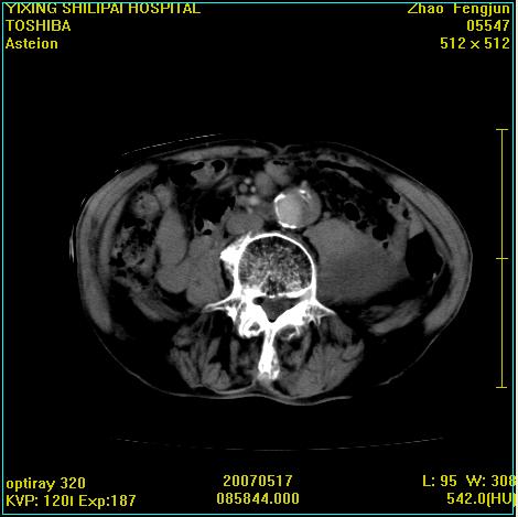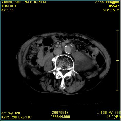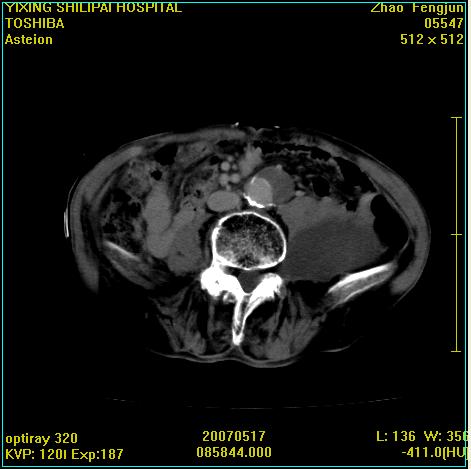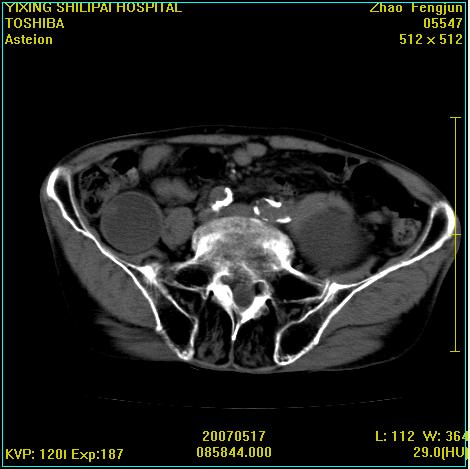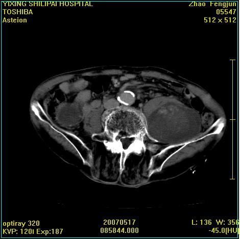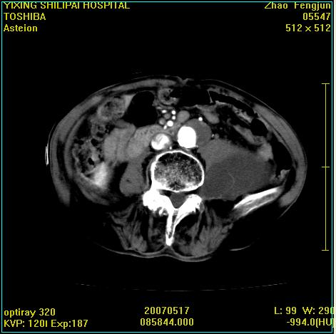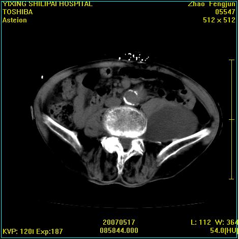 以下是引用xiaoniu在2007-5-26 10:45:00的发言:[br]腰大肌的病变应该没有问题,增强扫描还有轻度强化及细小血管影入内,应该排除脓肿,考虑占位性病变,腰大肌的占位多考虑:神经源性肿瘤。另外腹主动脉下端有真假腔的强化,考虑:主动脉夹层。[br][br][本贴已被 xiaoniu 于 2007-5-26 10:46:39 修改过]