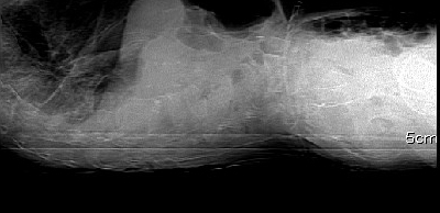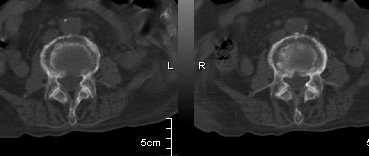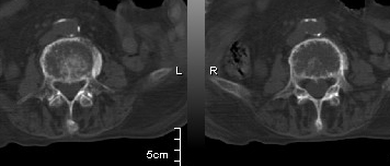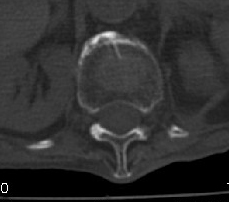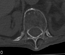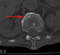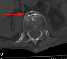 男:89岁因外伤后2天行ct检查。请各位战友讨论图中所指是否是骨折和形成该影像的原因(扫描层面位于椎体中份)。