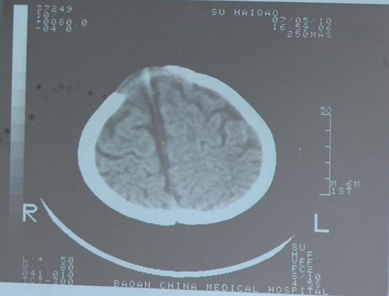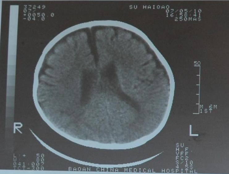 扫描所见:双侧额颞部颅骨内板下方见对称性带状脑脊液样低密度影,并向前纵裂延伸,两侧大脑半球、脑干及小脑实质密度未见异常,侧脑室及三脑室略宽,双侧额叶脑沟深深加宽。四脑室形态无变形、移位或扩张,中线结构居中。