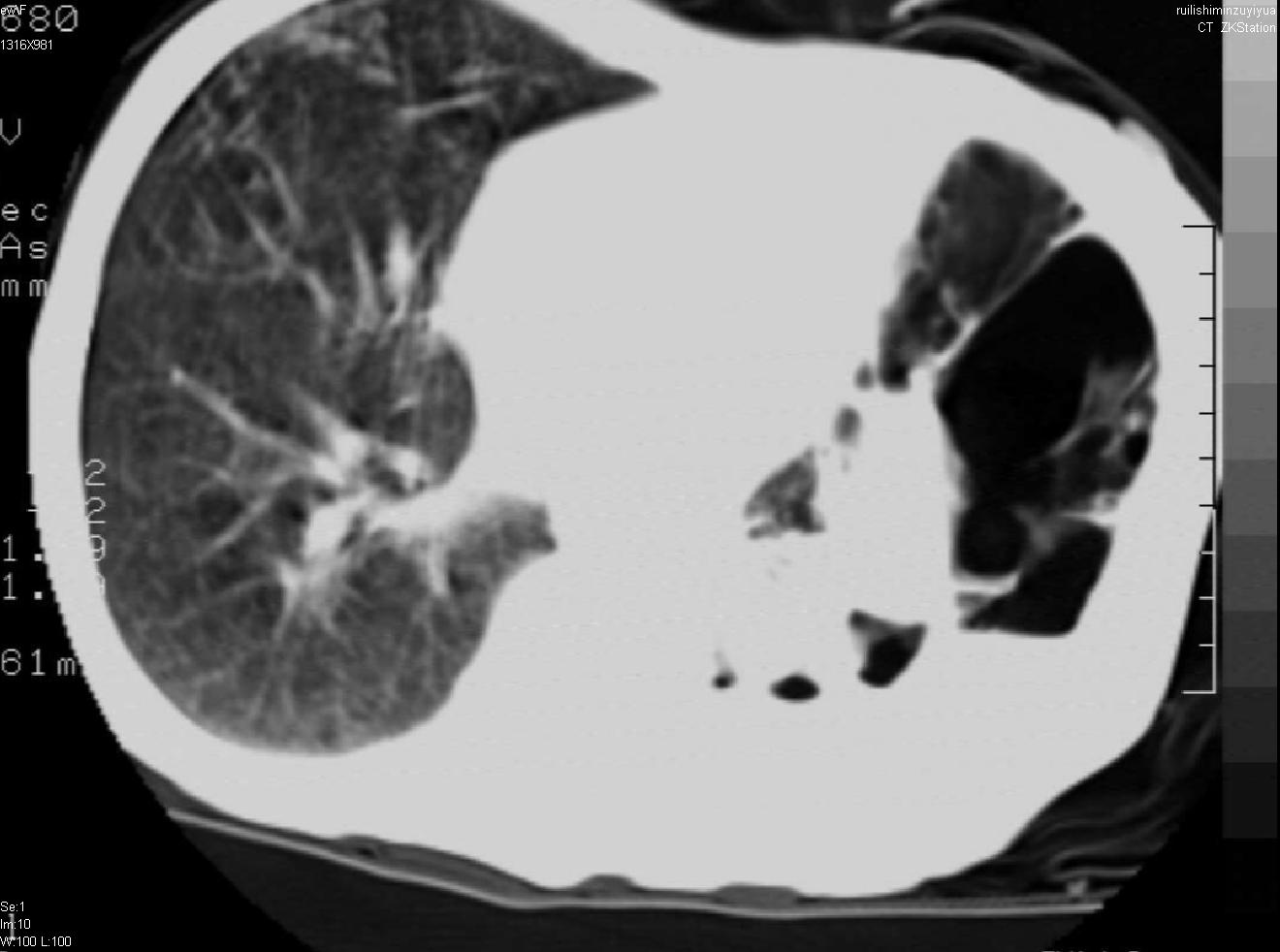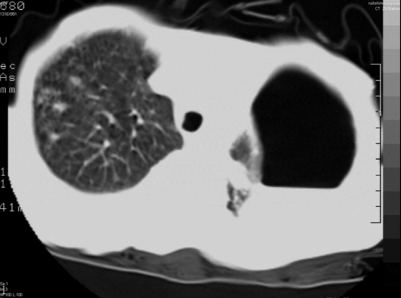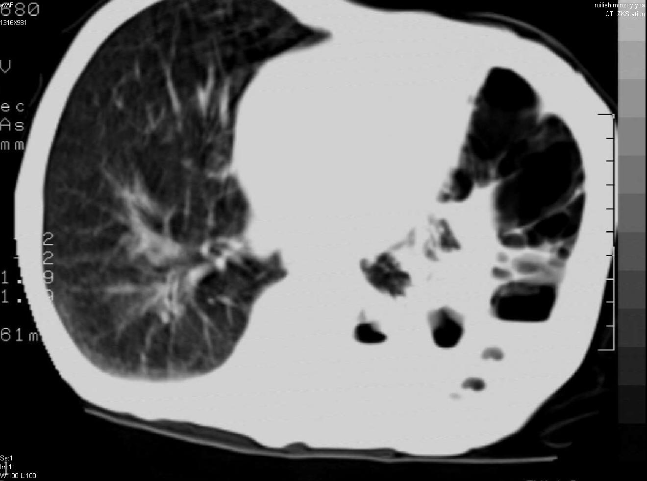以下是引用avril在2007-6-12 1:17:00的发言:[br]1、左肺毁损。[br]2、左肺多发肺大泡伴自发性气液胸形成。[br]3、右肺继发型结核。