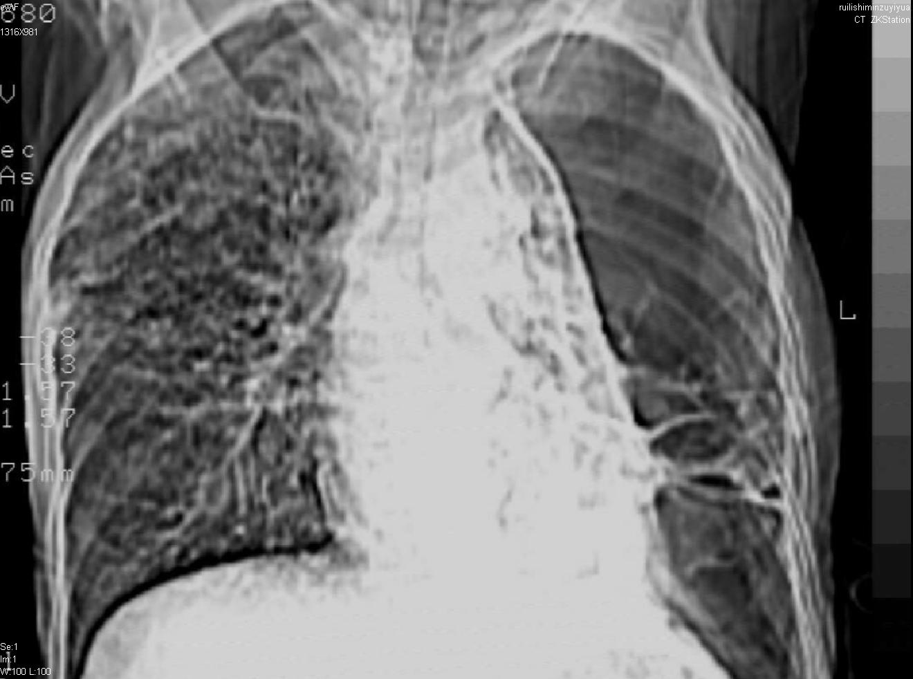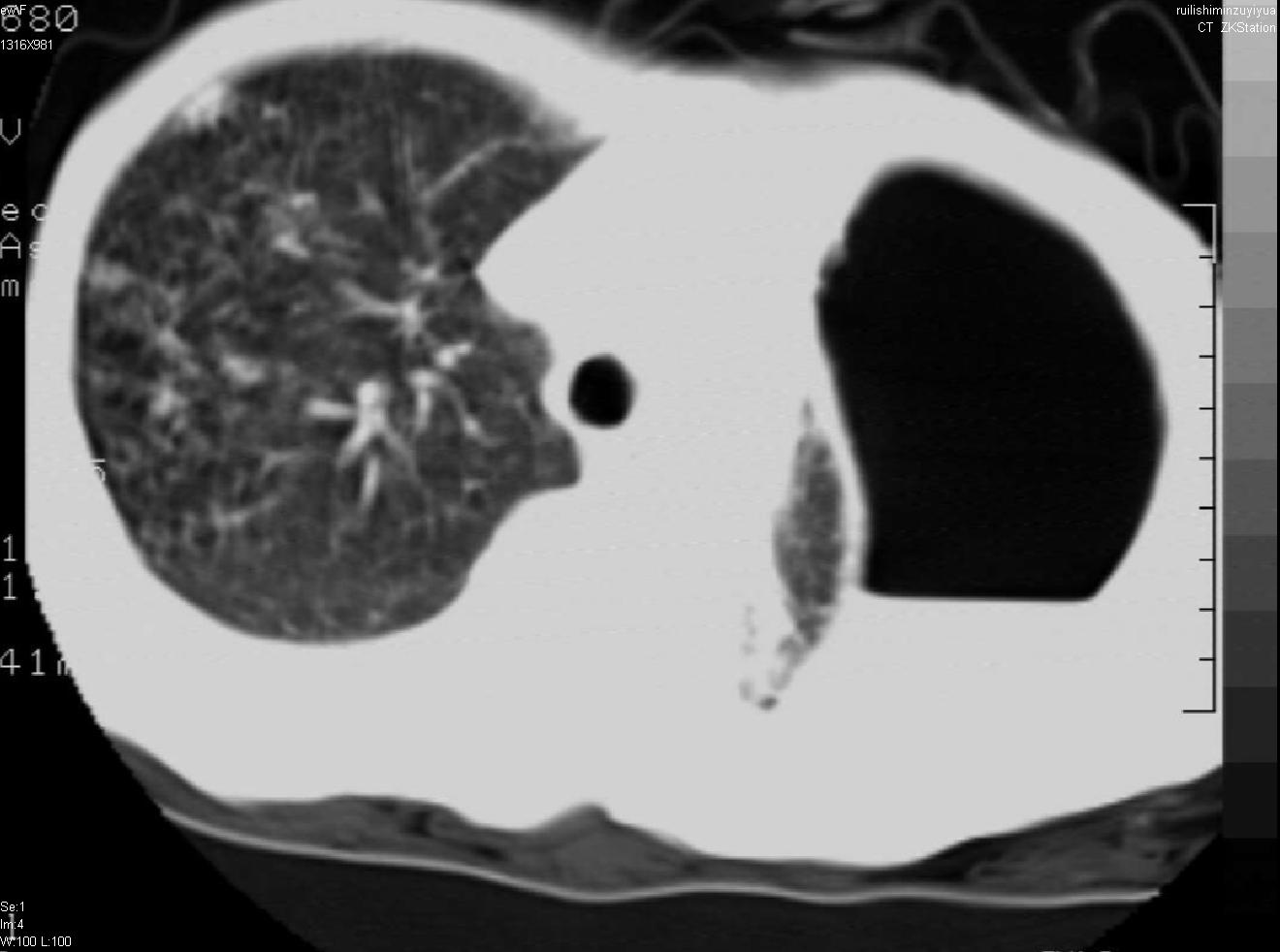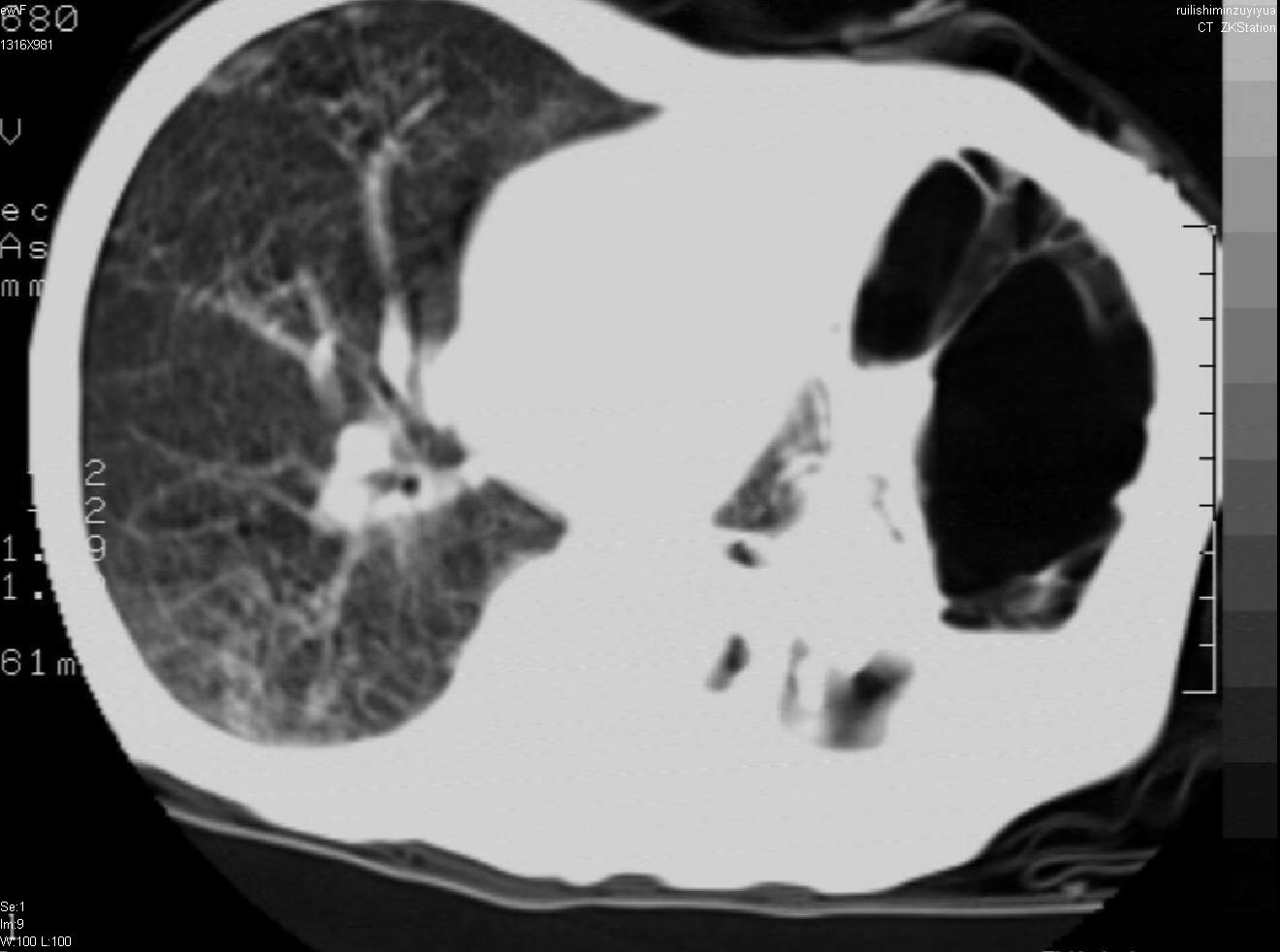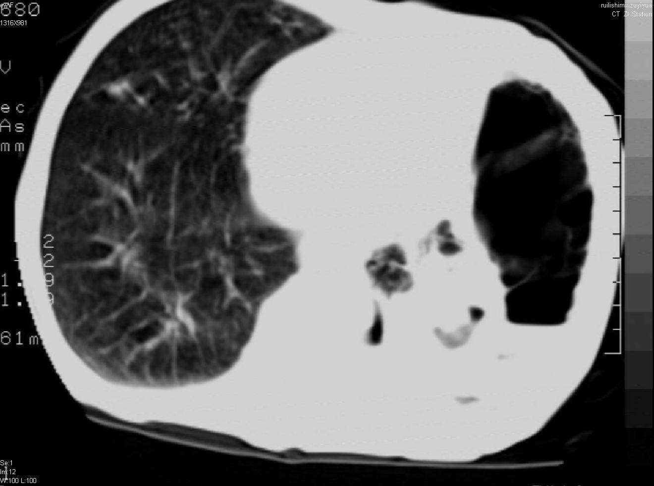 以下是引用avril在2007-6-12 1:17:00的发言:[br]1、左肺毁损。[br]2、左肺多发肺大泡伴自发性气液胸形成。[br]3、右肺继发型结核。
