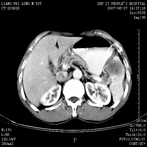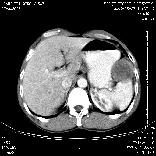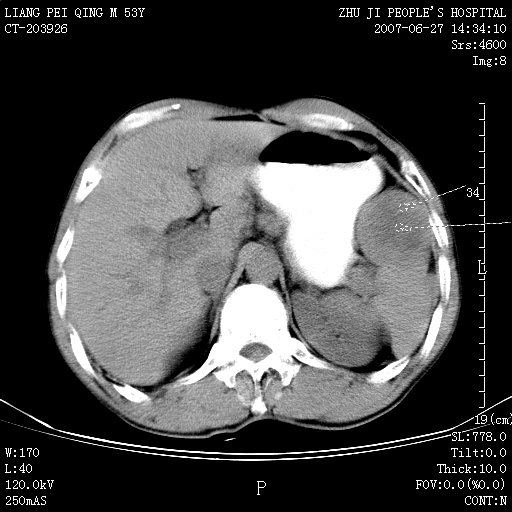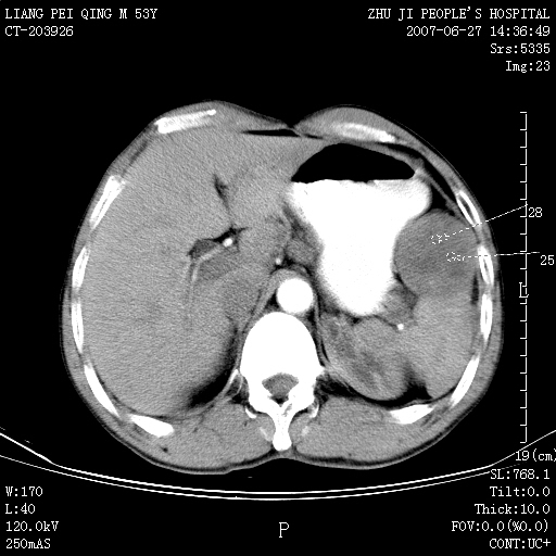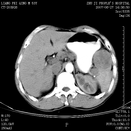 以下是引用狙击手在2007-6-28 10:35:00的发言:[br]1:定位:来源于脾脏。2:强化:强化,但不均匀。3:下腔静脉癌栓?下腔静脉充填不均匀与增强时间有关,延时即可明确。4:肋骨破坏?看起来并不确切。综上考虑几个最常见诊断:1;淋巴管瘤;2;血管内皮肉瘤(高度恶性,早期即可转移,常见肝,肺,骨)3;转移瘤(无特征性,只有肝或其它腹腔脏器有类似病变时,才可提示之)