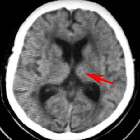 :1、左丘脑区脑出血吸收期改变。