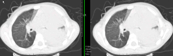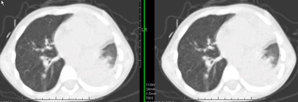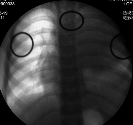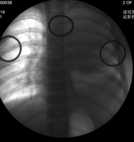 此病人是我接手的,发热、咳嗽来做胸透,透视见左侧肺野大部密实,纵隔、心影明显左移,呼吸示纵隔摆动、膈肌矛盾运动(透视下采集了几幅图片),左肺动度明显减弱。询问病人家长,没有吃花生米等呛咳史。由于其影像特征明显,当时诊断:考虑左侧支气管异物并阻塞性肺不张、肺炎。