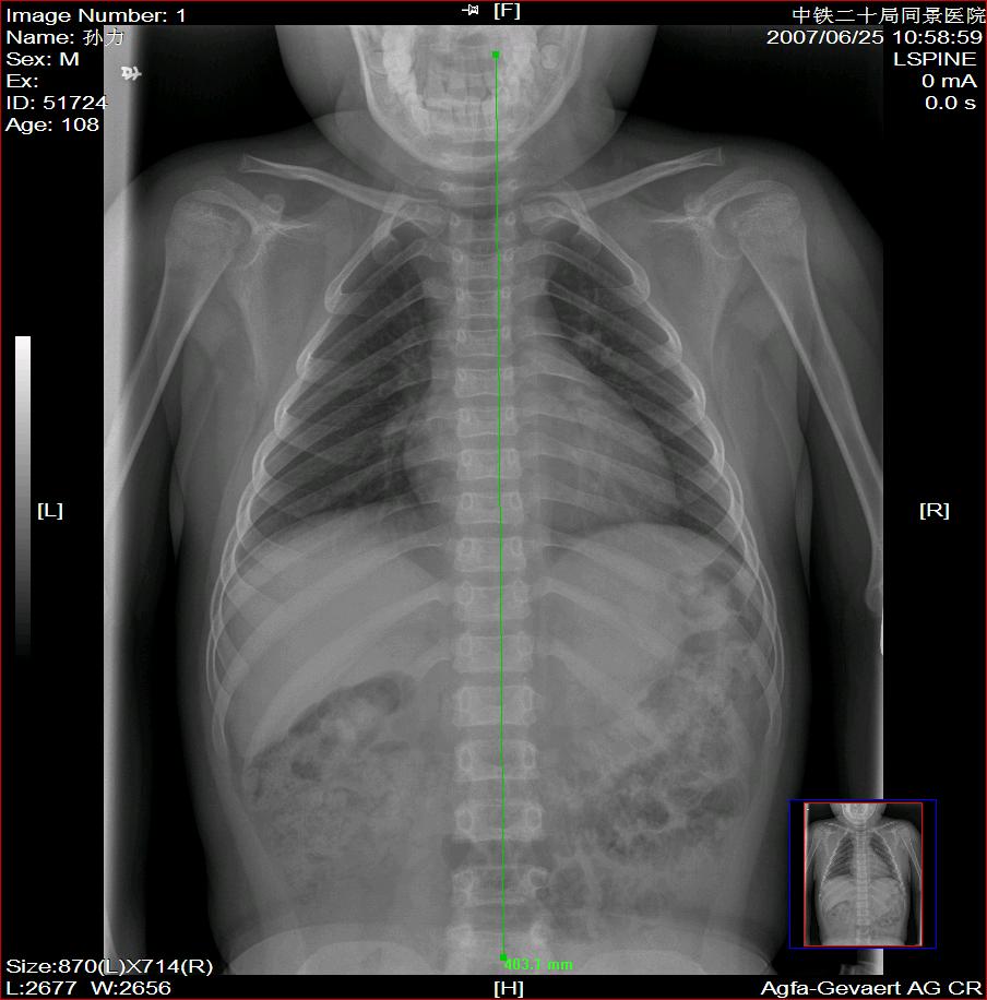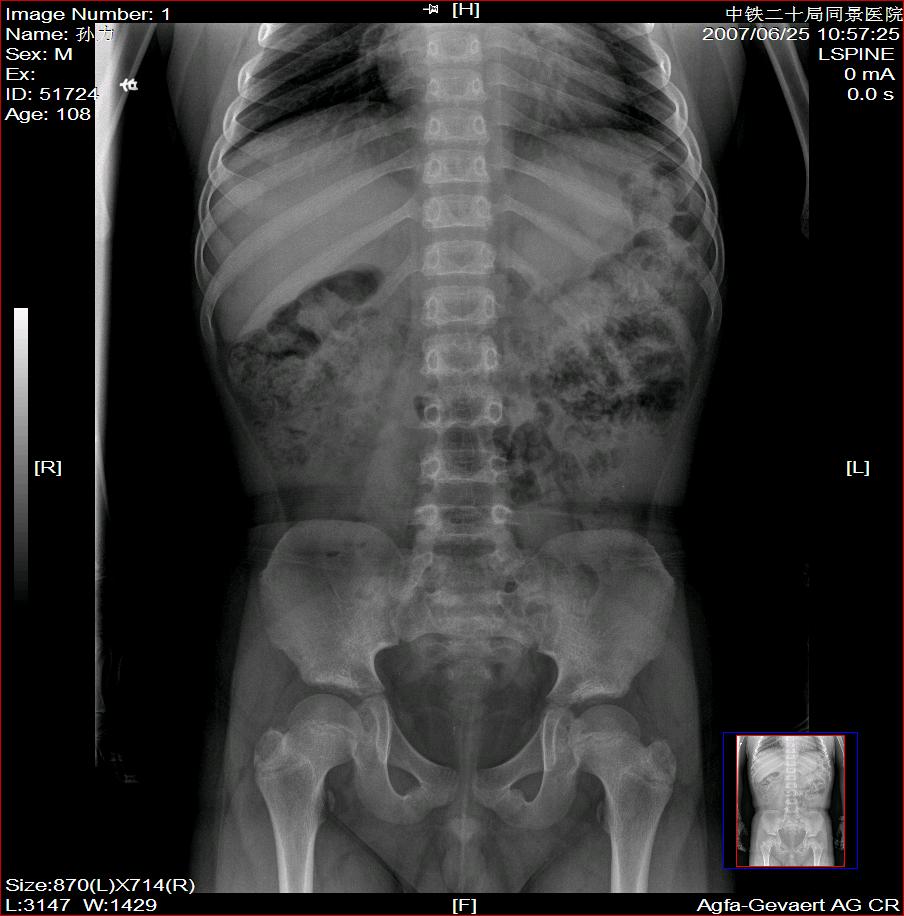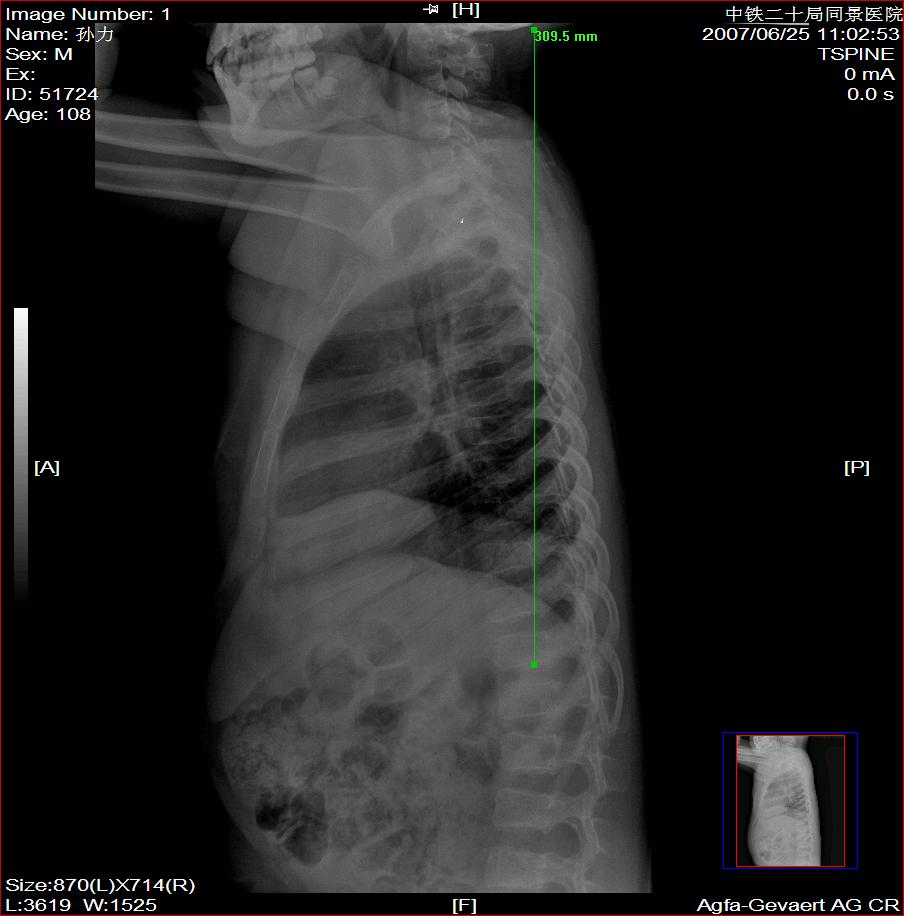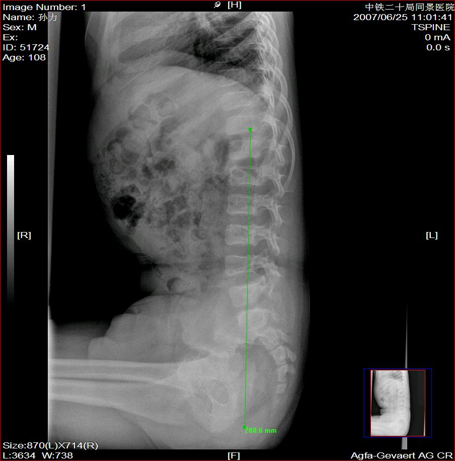 年龄17岁,身材矮小(1.2m),全身骨骼发育迟缓,骨骺线仍较宽,但全身骨骼骨质正常,智力正常。