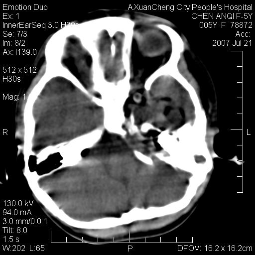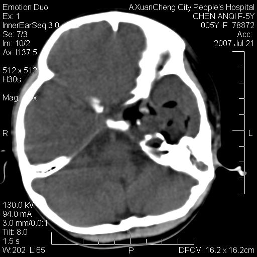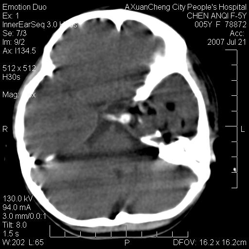 以下是引用liaizhi在2007-7-21 11:00:00的发言:[br]左侧中耳炎并胆脂瘤,左颞骨岩部骨质破坏并颅内感染积气。