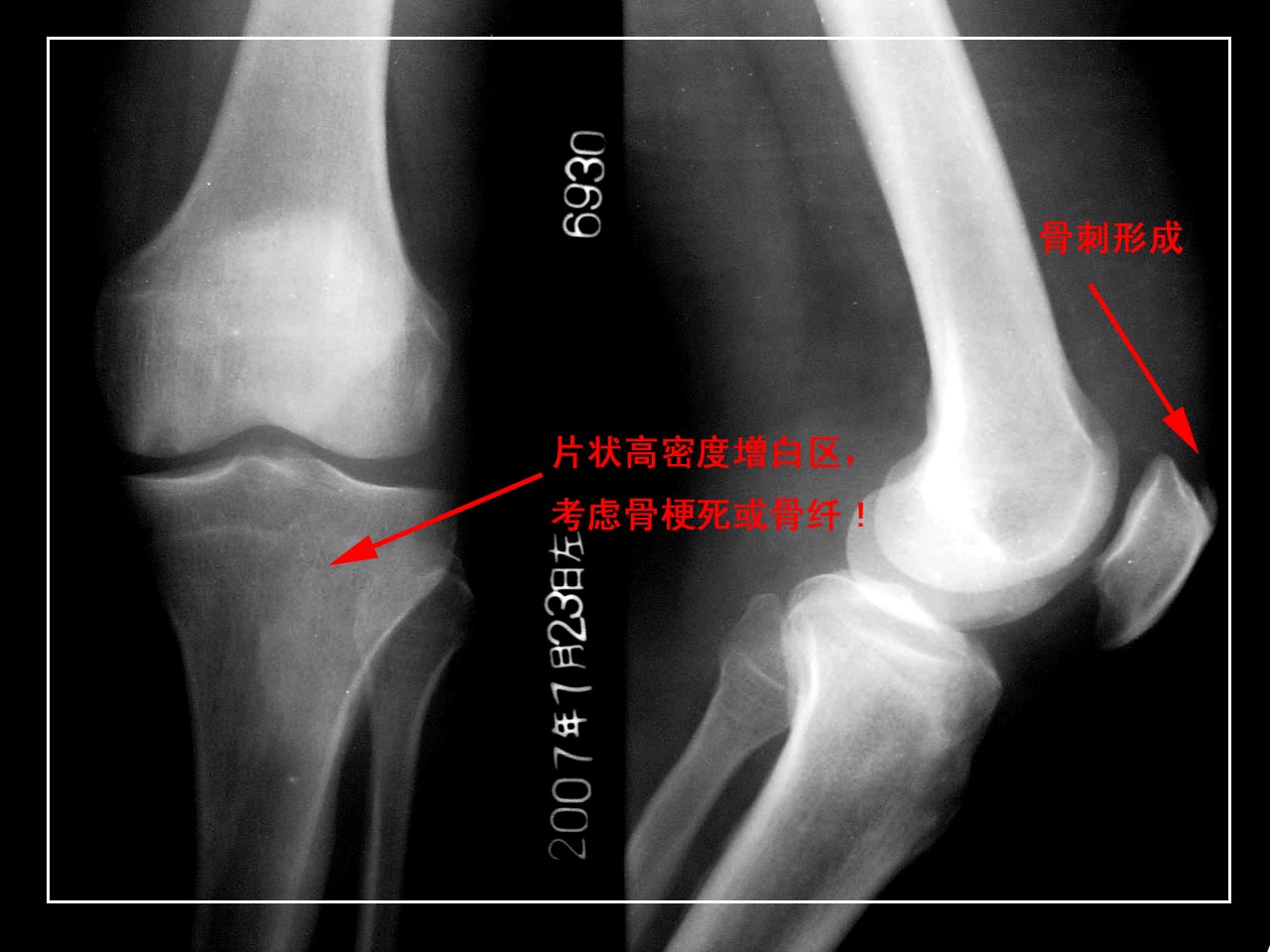 以下是引用zjzjr在2007-7-26 20:55:00的发言:[br]考虑:1、左侧股骨内髁剥脱性骨软骨炎;[br] 2、髌骨前上缘骨刺。