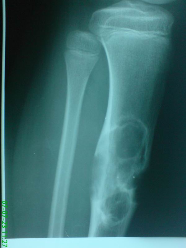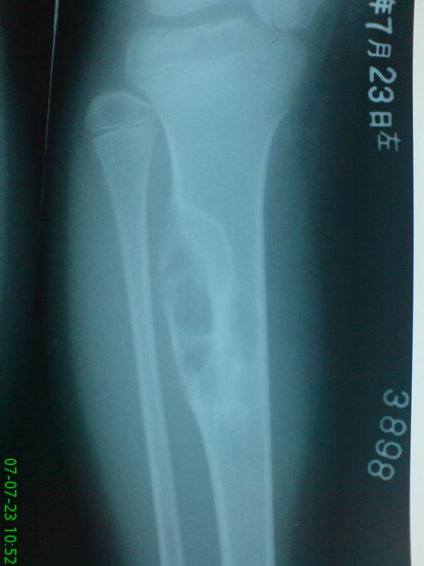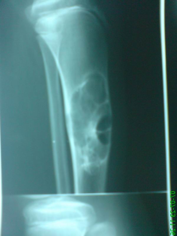 胫骨中上段多房囊肿,呈蜂窝状向外膨胀,囊内含有粗细不等的房间隔,偏心性生长。考虑良性骨肿瘤----1软骨粘液性纤维瘤。2骨化或非骨化性纤维瘤。