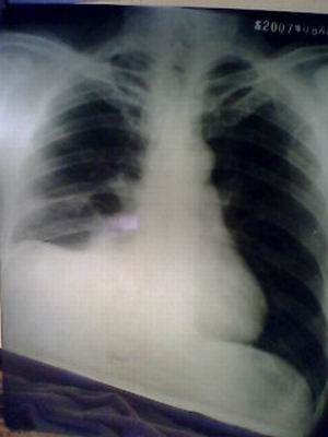 右侧心隔角区模糊不清,右叶间胸膜增厚,右隔顶外移。支持肺底积液,右肺中叶炎变?