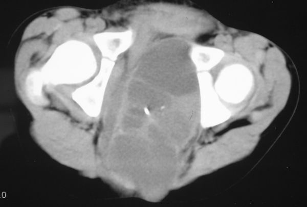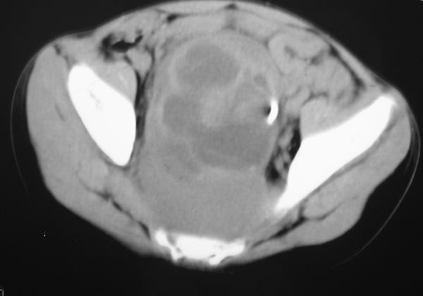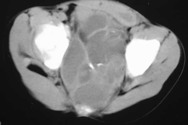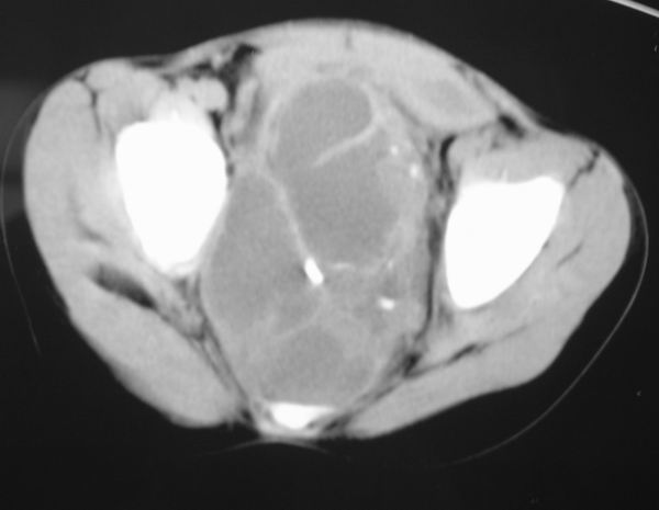 畸胎瘤!本人曾见过一例成年女子盆腔畸胎瘤长至臀部软组织内!
