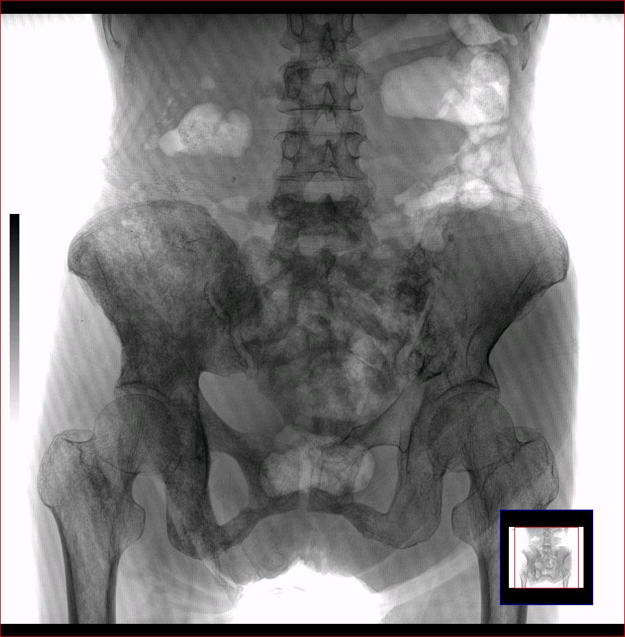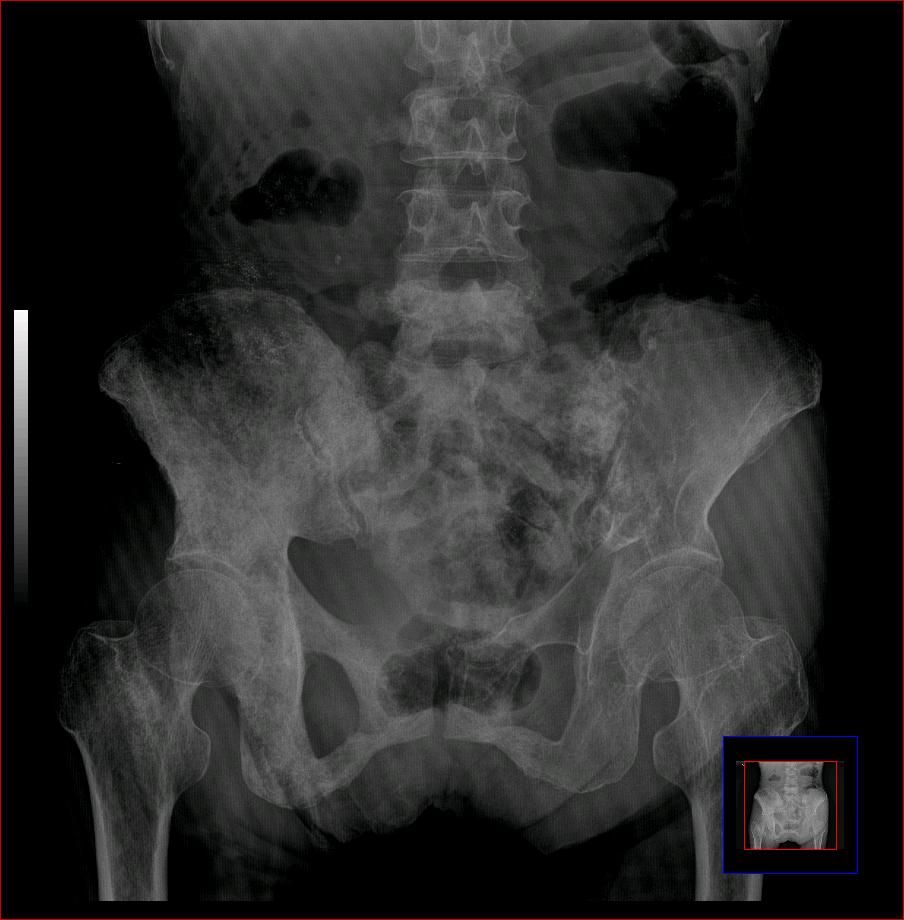 以下是引用qiushi在2007-8-22 21:39:00的发言:[br]双侧髂骨、骶骨侧快呈溶骨样骨质破坏,边缘模糊,左侧髂骨见骨折线,左侧髂部见软组织块影。考虑骨纤维肉瘤(中央型)伴病理性骨折,不排除骨髓瘤。建议本--周氏蛋白检查。[br] 鉴别点:[br] 骨纤维肉瘤,中央型者示边缘模糊的囊状溶骨破坏,一般无骨膜反映,可膨胀变形,突破骨皮质可形成软组织肿块,或并发病理性骨折。[br] 骨髓瘤,常表现为广泛的骨质疏松,皮质变薄或破坏,呈粟栗状、穿凿状、鼠咬状骨质破坏,边缘清晰,周围无硬化。[br] 骨转移瘤(溶骨型),表现为虫噬样、泡沫状圆形或卵圆形破坏区,很少出现软组织块影。[br][br][本贴已被 qiushi 于 2007-8-23 6:20:19 修改过]