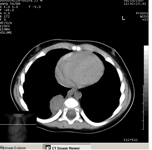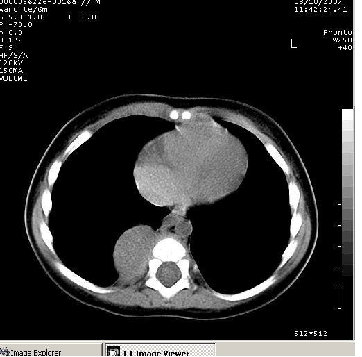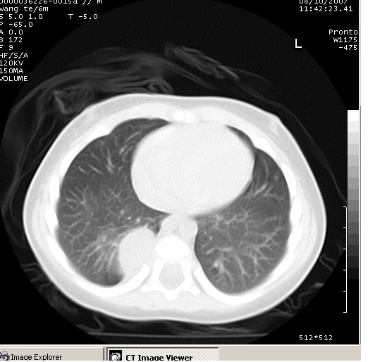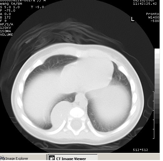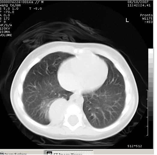 患儿男、6个月,因咳嗽三天曾拍胸片考虑肺部感染,这是在胸片后约一周左右作的ct。