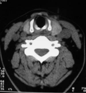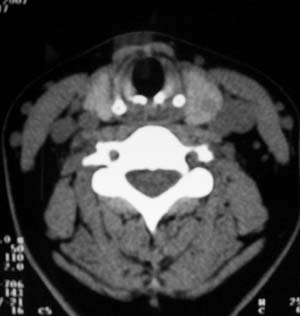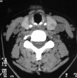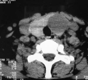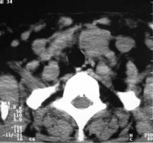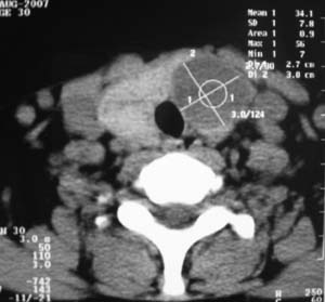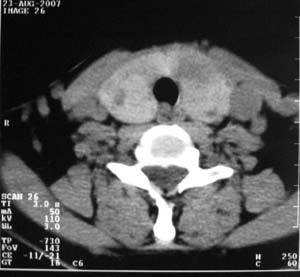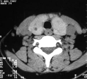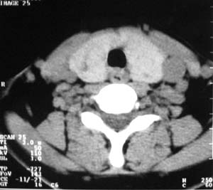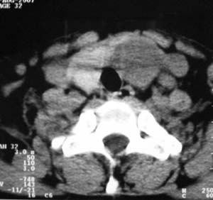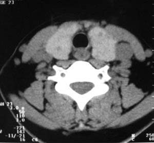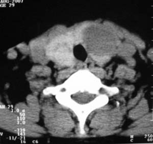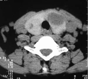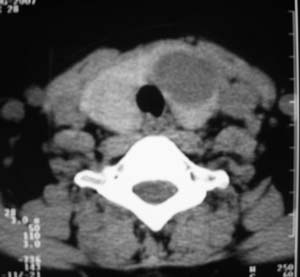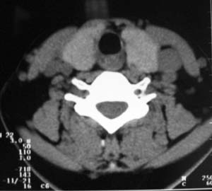 以下是引用liaizhi在2007-8-27 15:20:00的发言:[br]双侧甲状腺散在多个囊性第密度影,左侧最大一个病灶与正常甲状腺分界尚可,气管受压稍右移。考虑甲状腺瘤的可能性大。