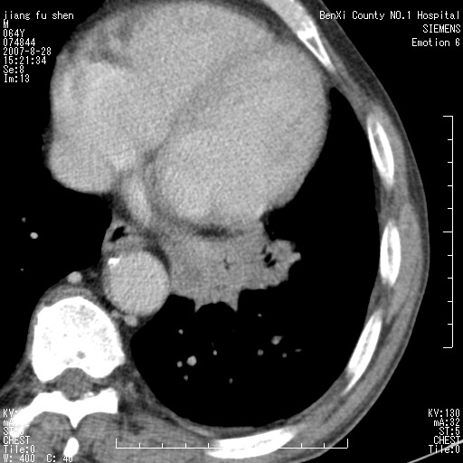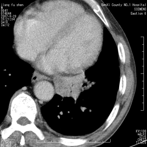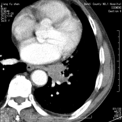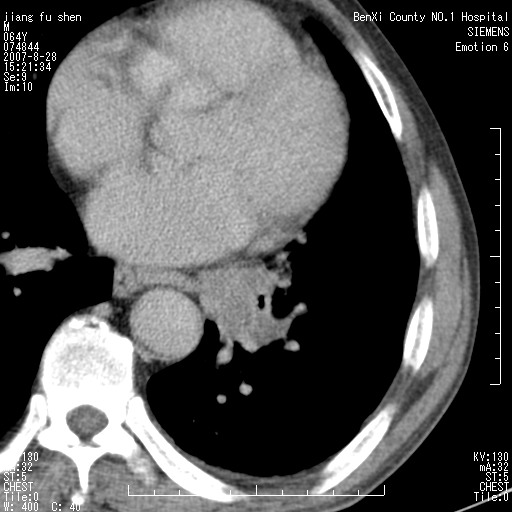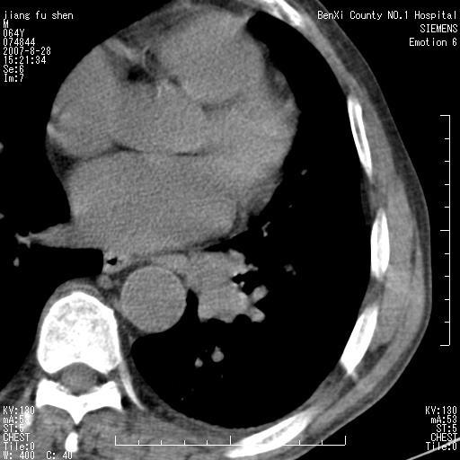 本次扫描患者未带原片,左肺下叶发现病灶。左肺上叶空洞,5组淋巴结肿大,1cm左右。