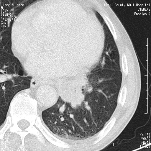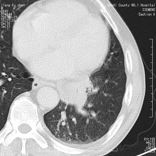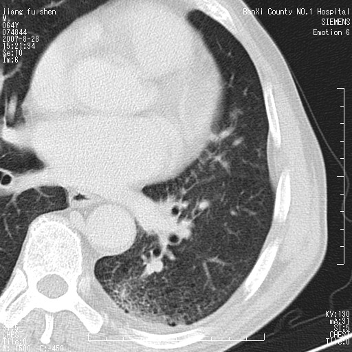 男、64、咳嗽、发烧一周、左肺呼吸音稍弱。既往肺结核,右手结核。