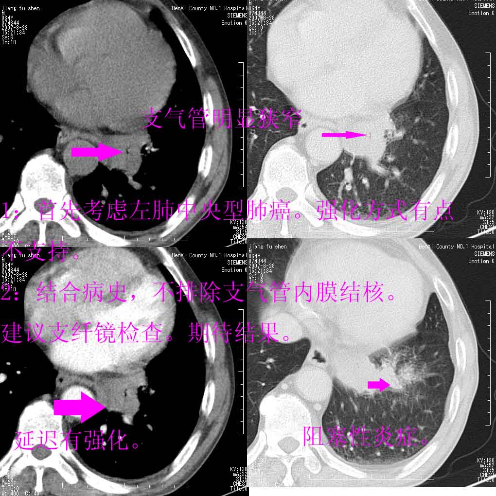 左下叶支气管变窄,管腔光滑。软组织形状不规侧,分叶呈角形。结合病史考虑结核可能性大。肺癌不除。