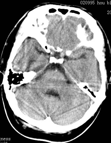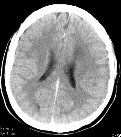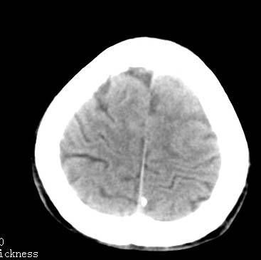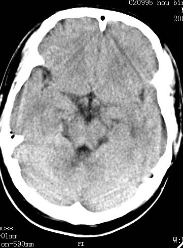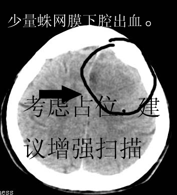 以下是引用clj20在2007-8-29 9:47:00的发言:[br]蛛网膜下腔出血,左侧额叶不均匀密度影,占位效应明显,界限不清。支持:占位性病变,建议增强!