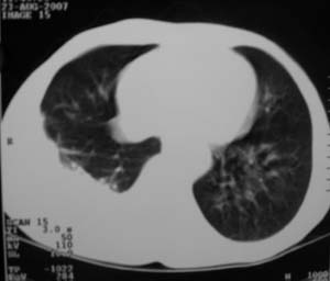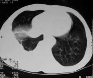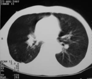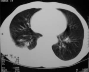 男,54岁,无任何不是感.体检发现右肺部阴影.现行ct进一步确诊.