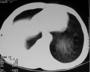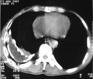 包裹性积液伴胸膜钙化 (根据病史考虑结核性)