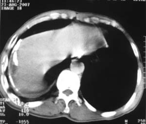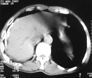 CT9556:男,54岁,包裹性积液,请各位老师会诊其原因!