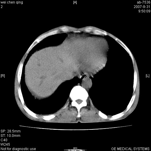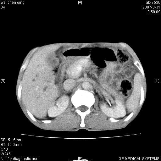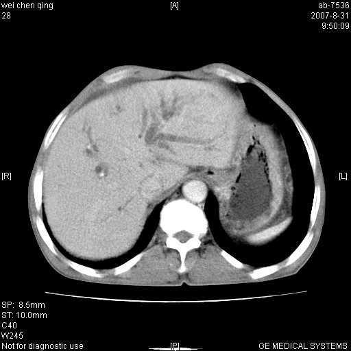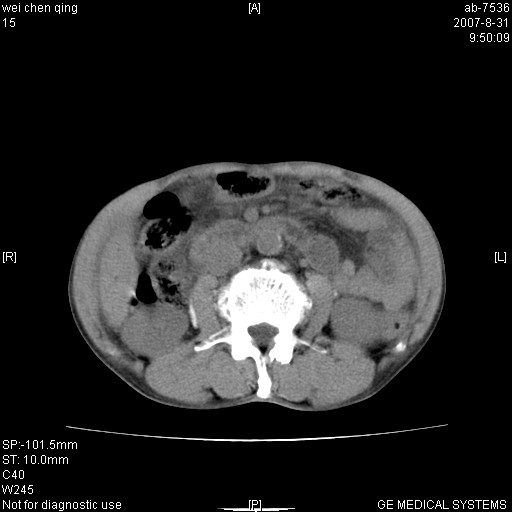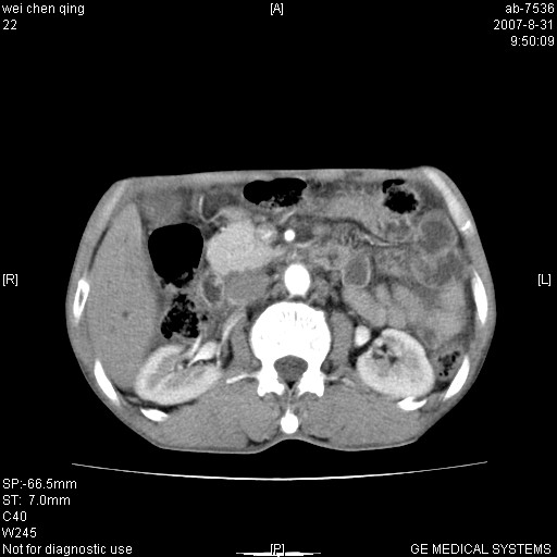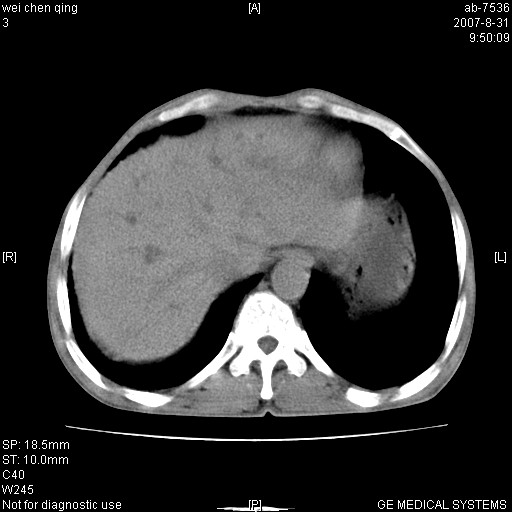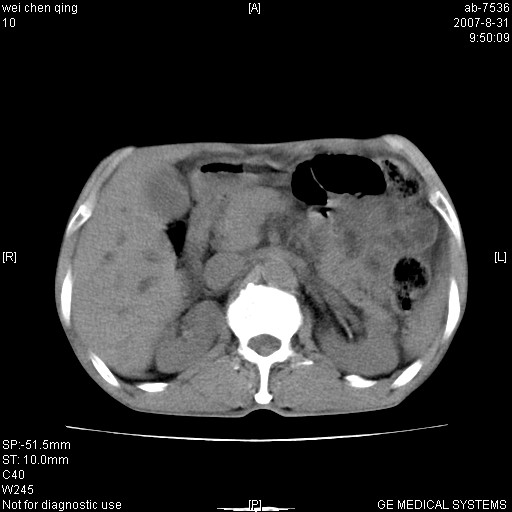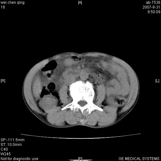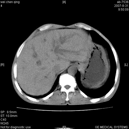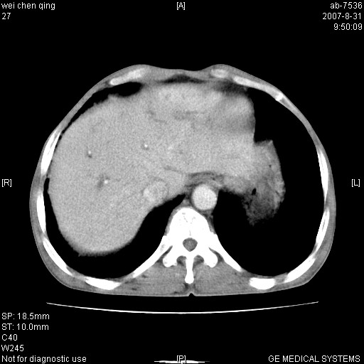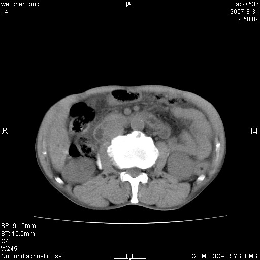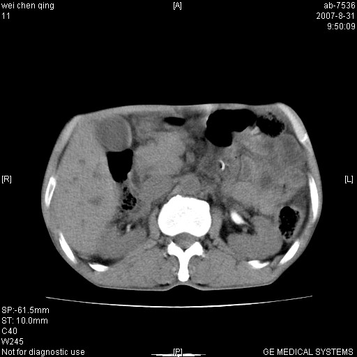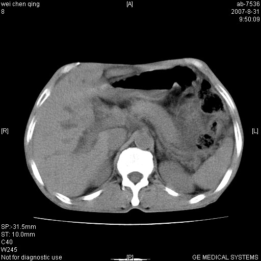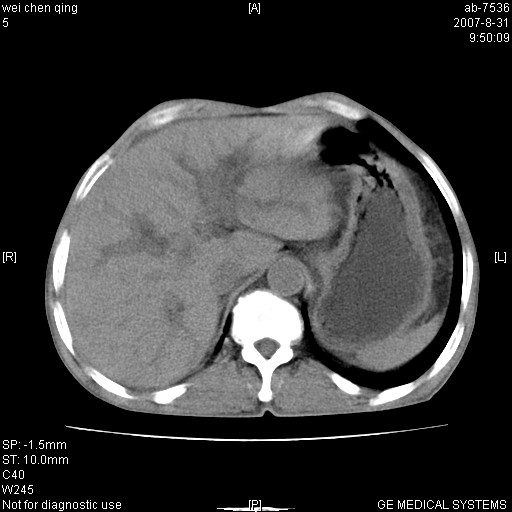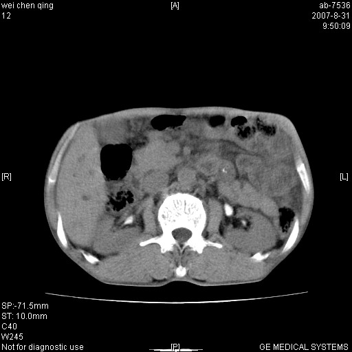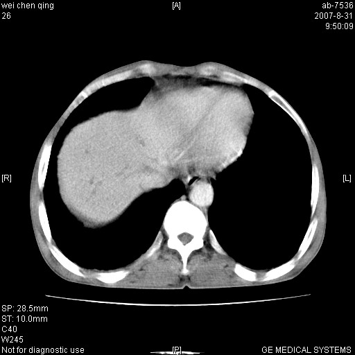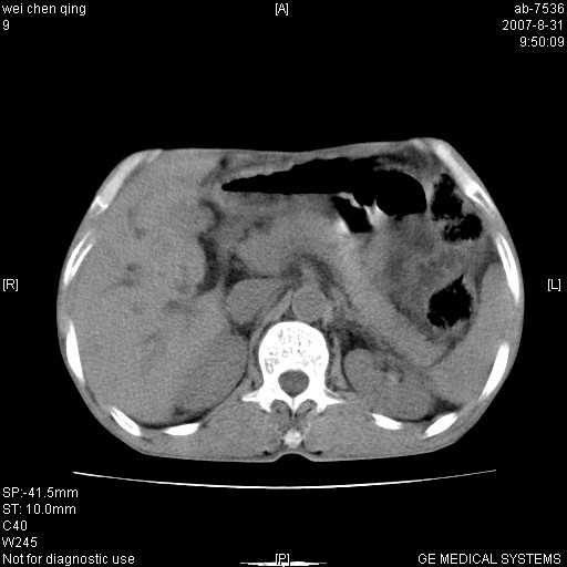 以下是引用zyyzzy在2007-8-31 14:34:00的发言:[br]该病人肝内胆管扩张,胆囊及胆总管未见明显扩张。在倒数第9层图像上可看到左右肝管结合部(肝总管)有软组织影,此处应薄层扫描。考虑肝总管占位(ca)、腹水。[br]