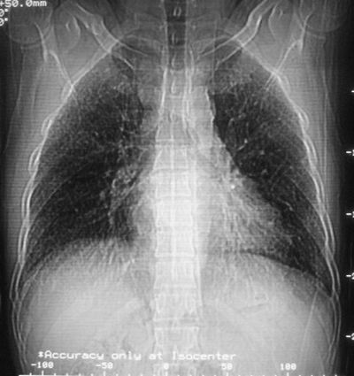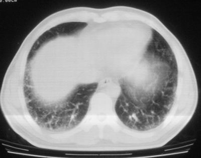 双肺纹理增强并可见网格状影达外带,考虑双肺感染并轻度间质纤维化