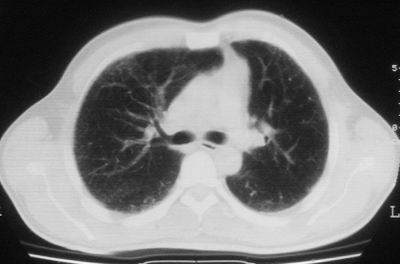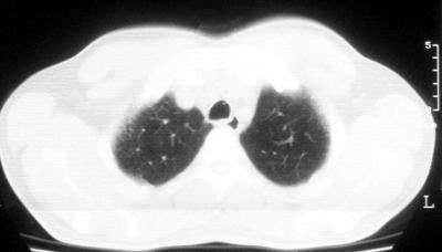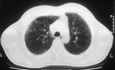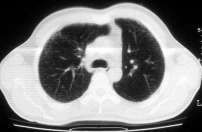 双肺散在小结节影,考虑粟粒性肺结核.肺窗薄扫会更好看些.