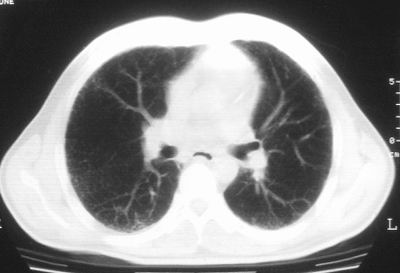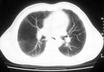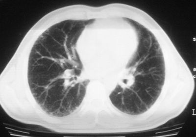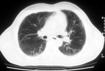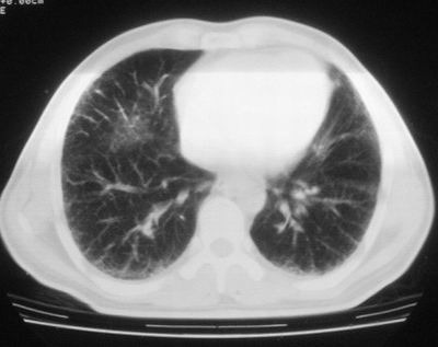 1\\粟粒性肺结核可能性大,支气管肺泡癌不排除