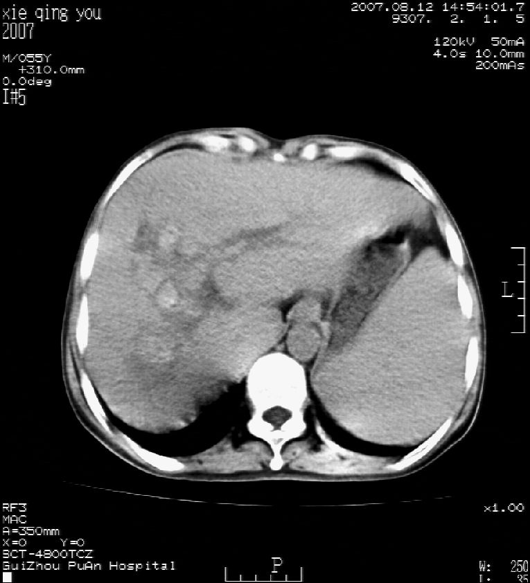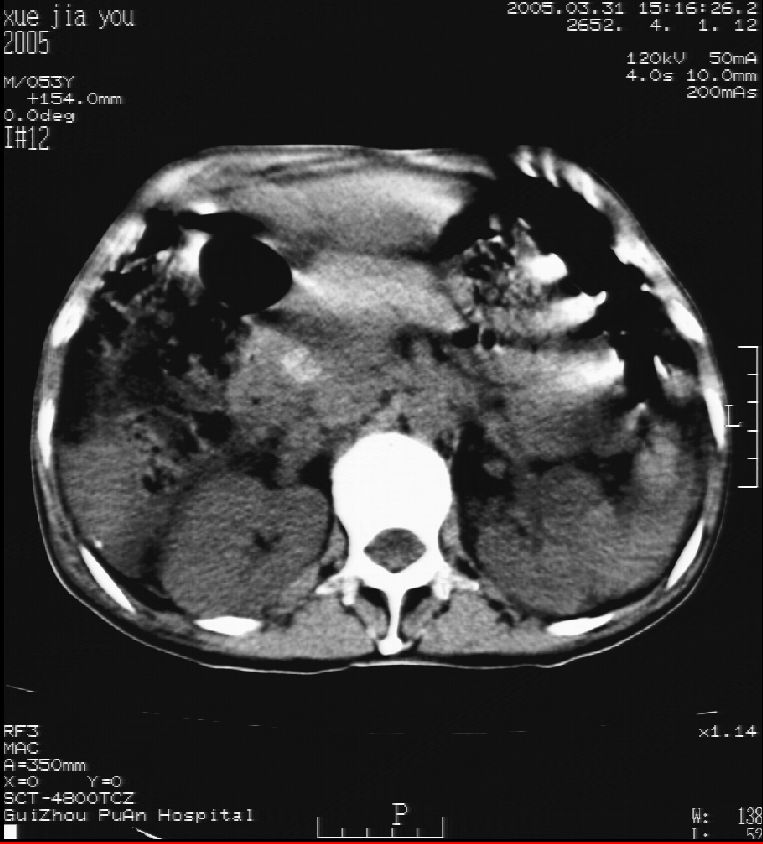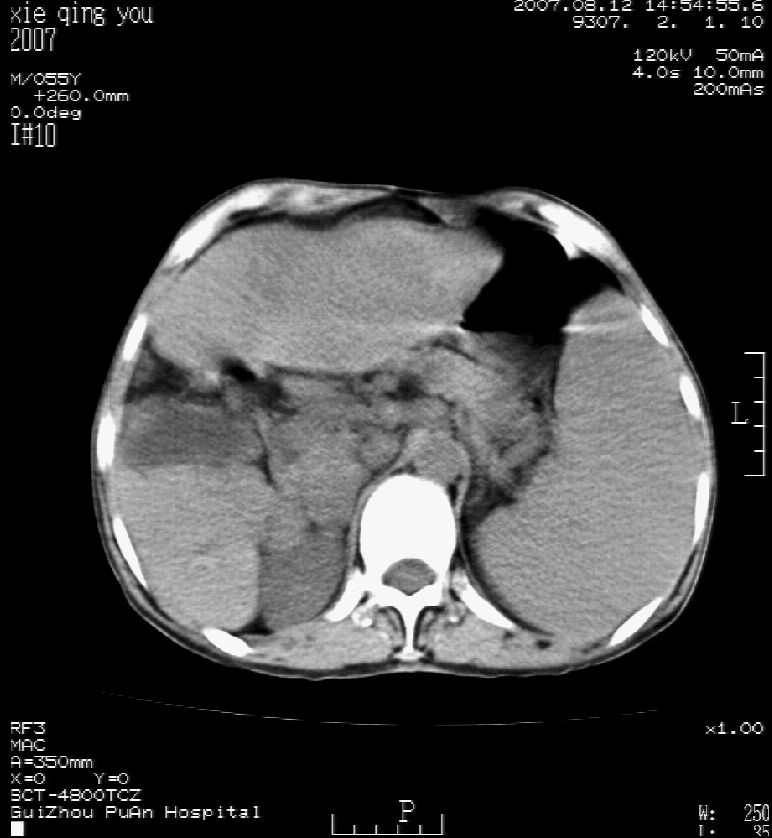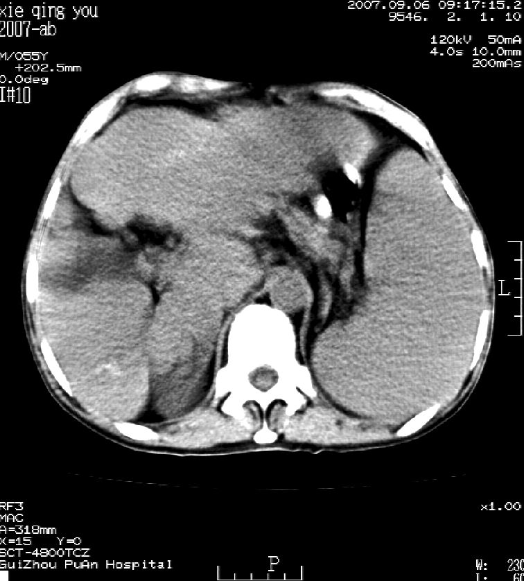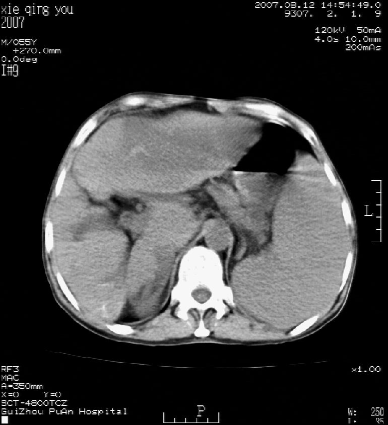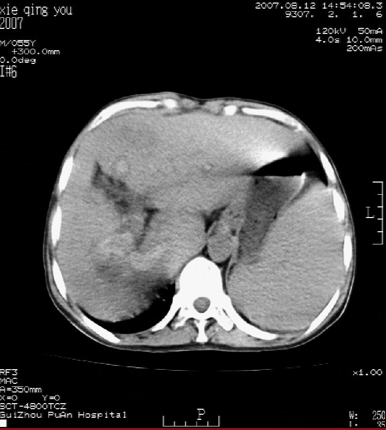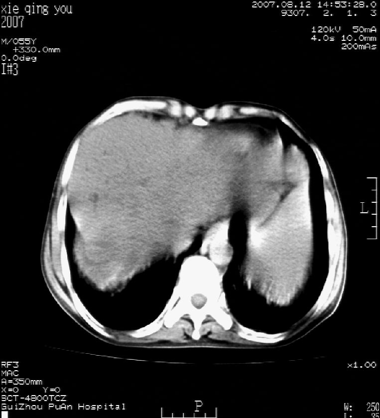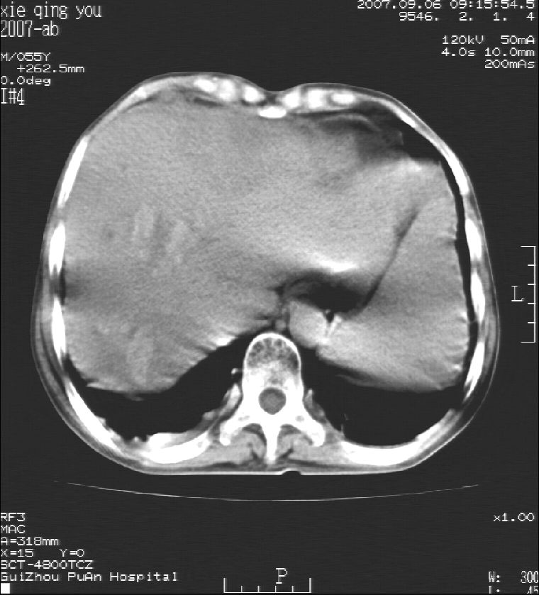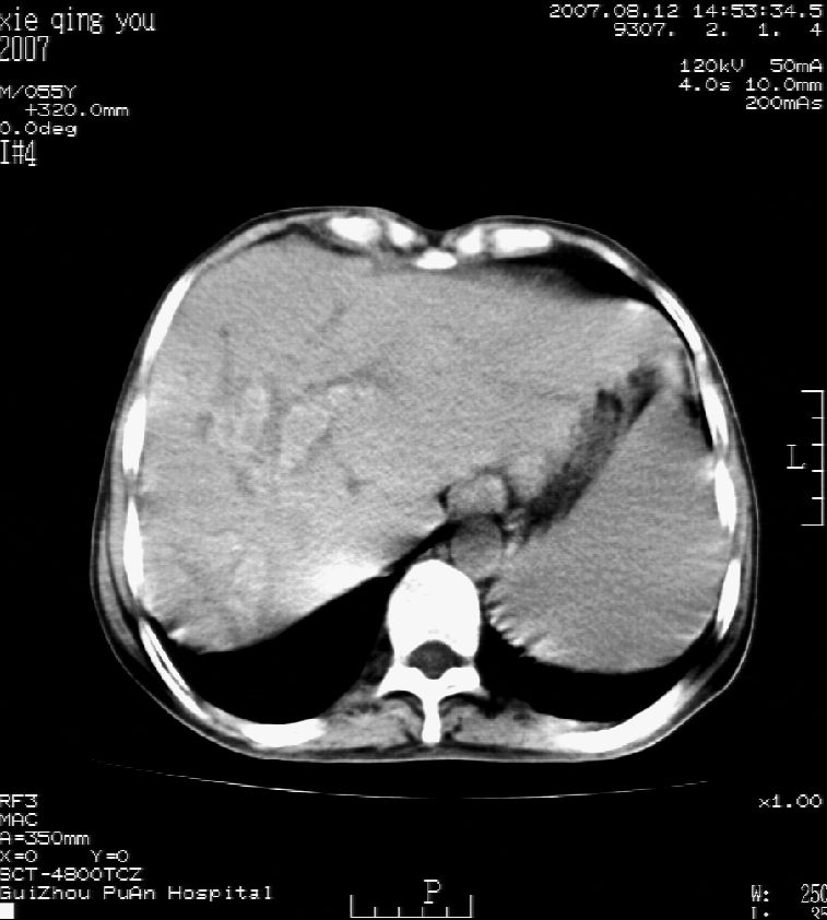 男 55岁 反复上腹痛1年,伴恶心呕吐。2005年做第一次检查后,到外院做b超检查提示肝囊肿,未做任何手术。2006年做过胆总管结石术。骨窗未见异常