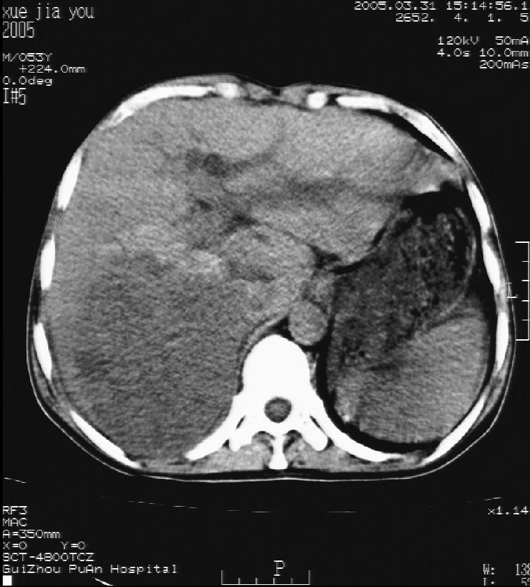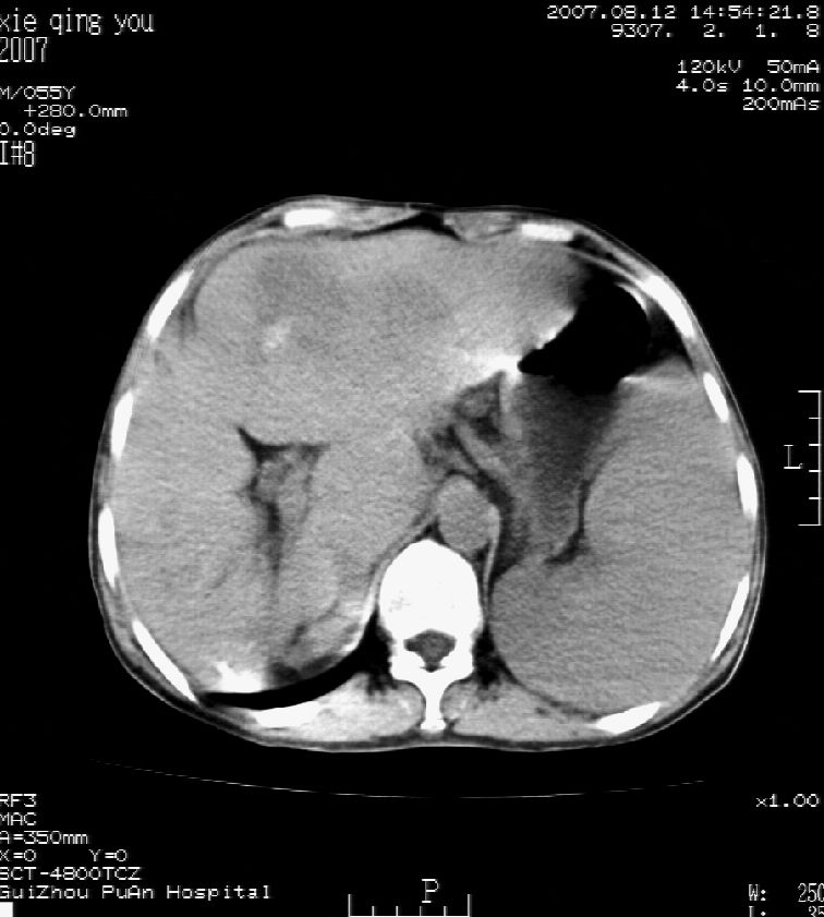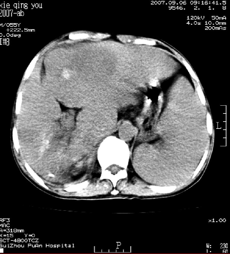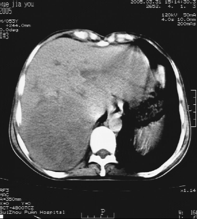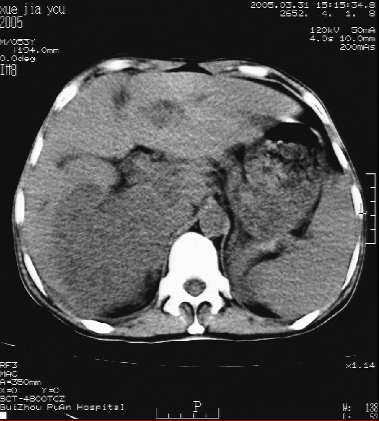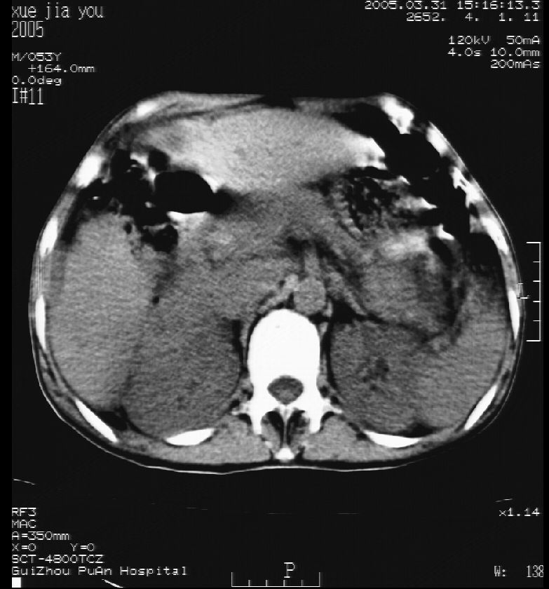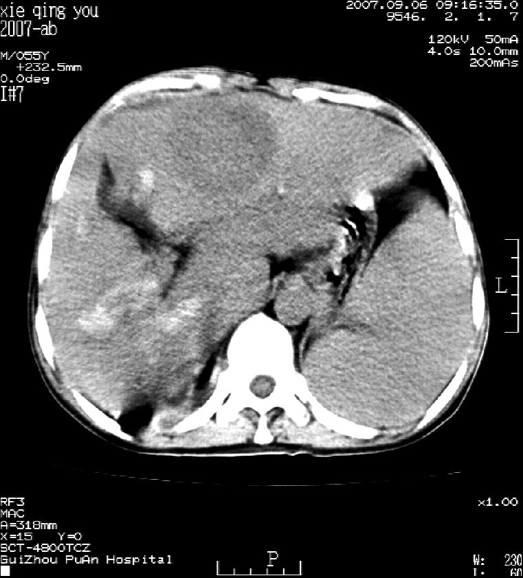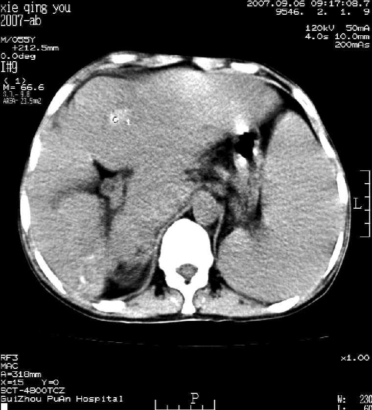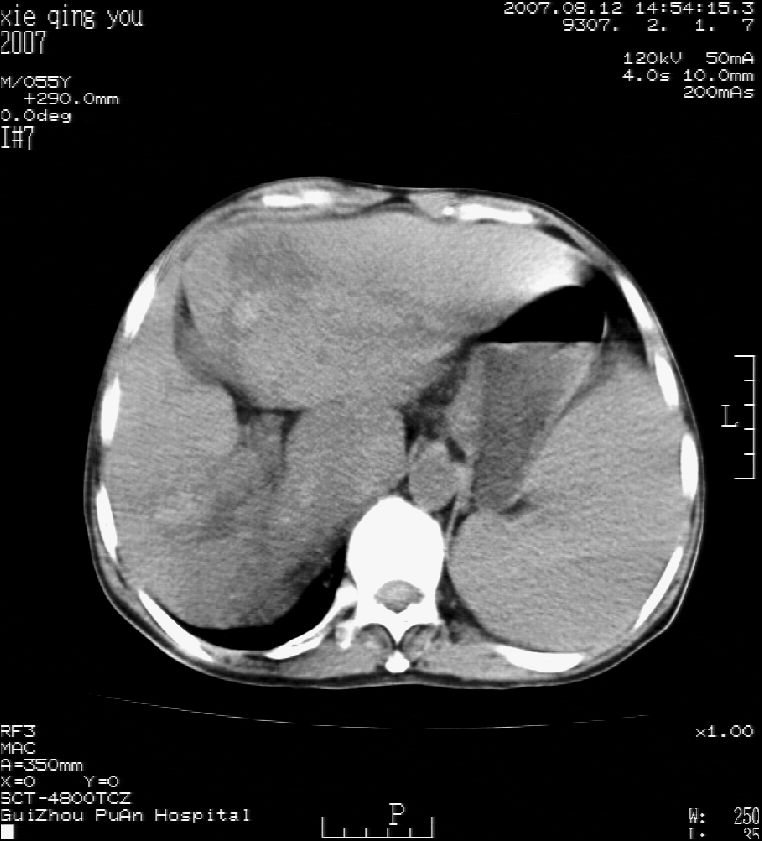 男 55岁 反复上腹痛1年,伴恶心呕吐。2005年做第一次检查后,到外院做b超检查提示肝囊肿,未做任何手术。2006年做过胆总管结石术。骨窗未见异常