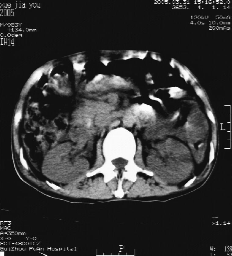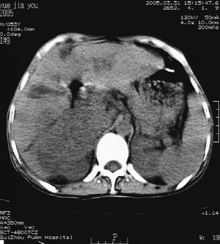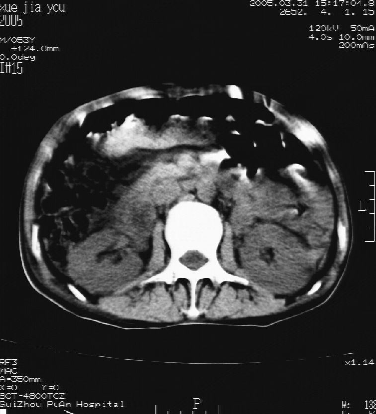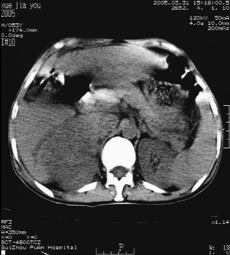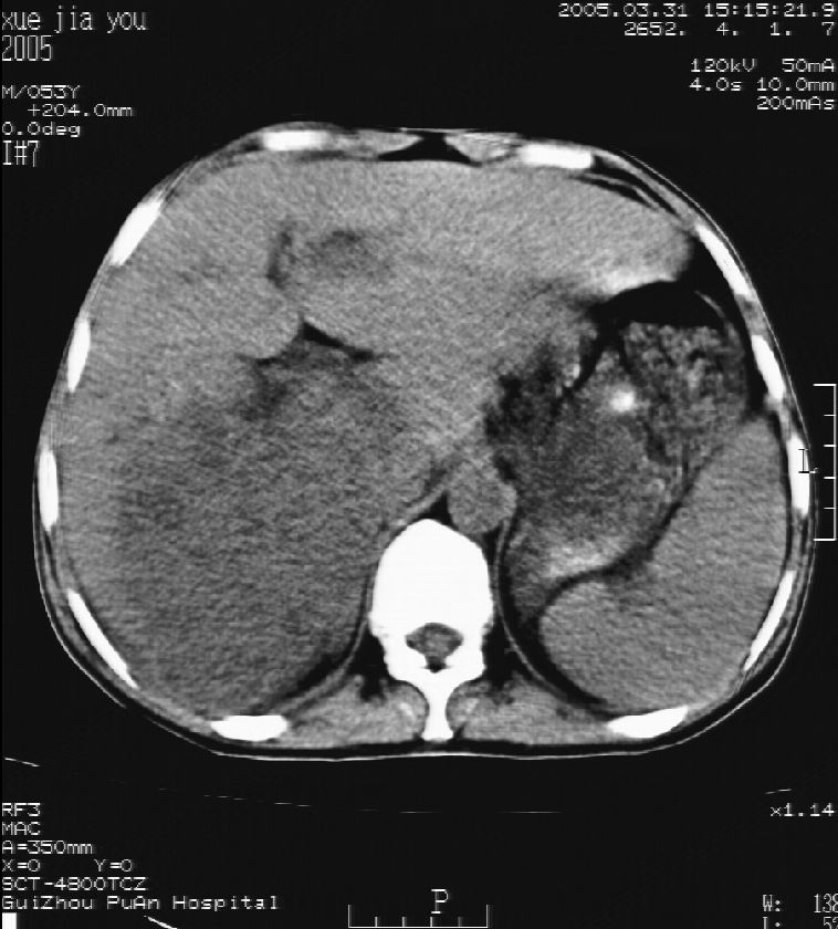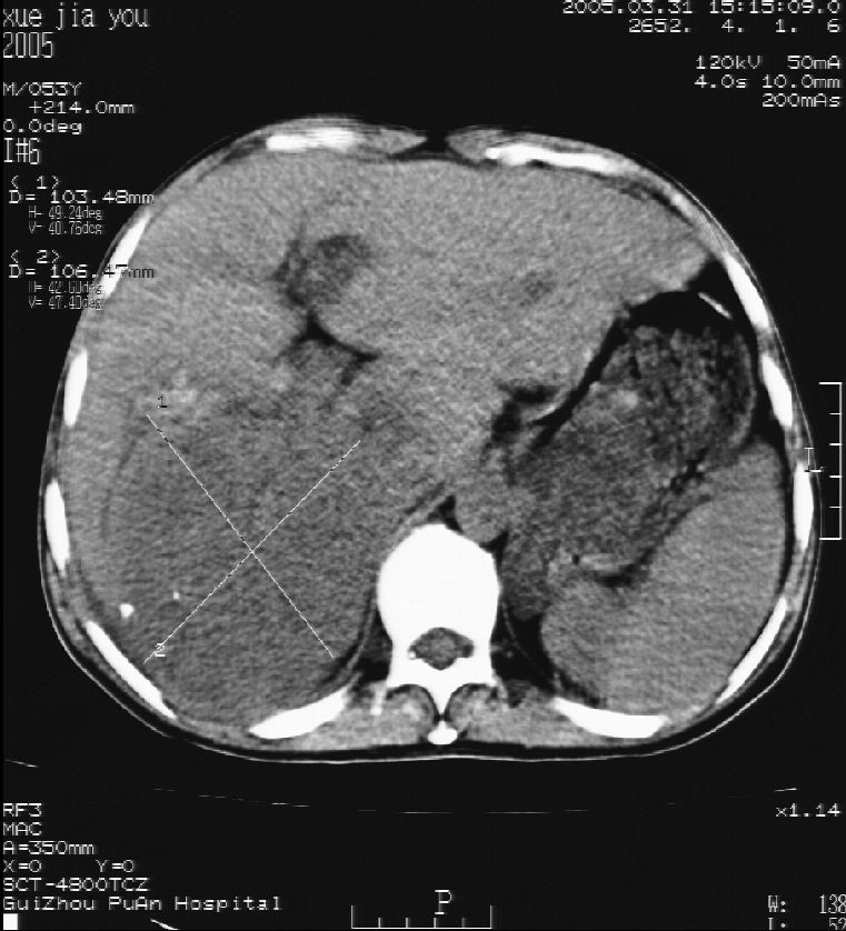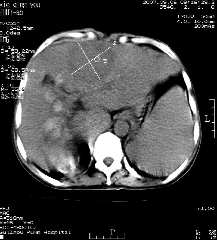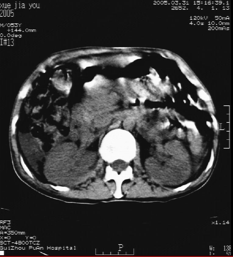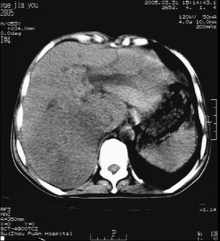 男 55岁 反复上腹痛1年,伴恶心呕吐。2005年做第一次检查后,到外院做b超检查提示肝囊肿,未做任何手术。2006年做过胆总管结石术。骨窗未见异常