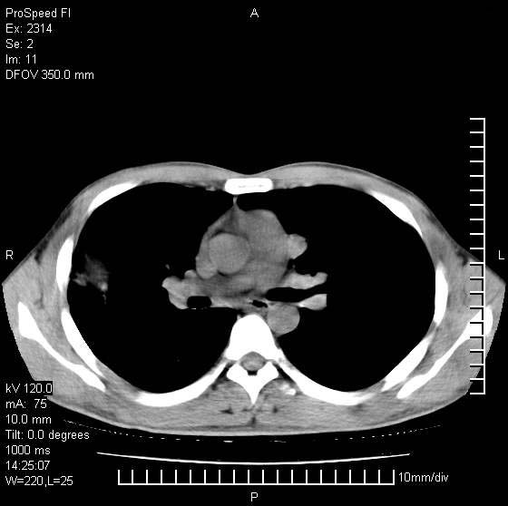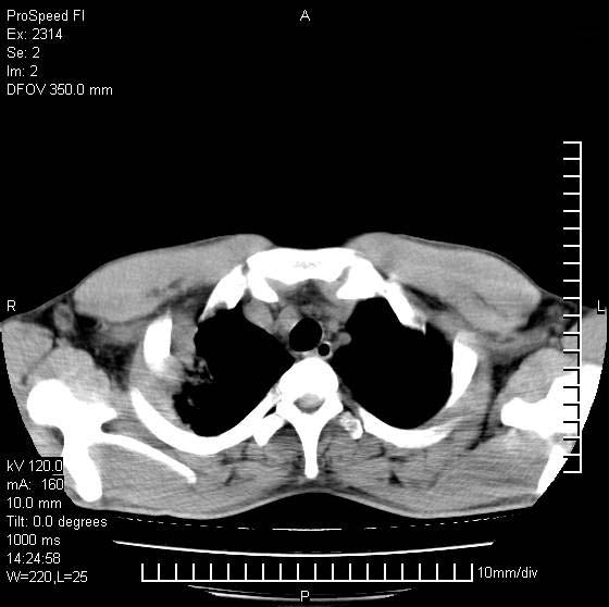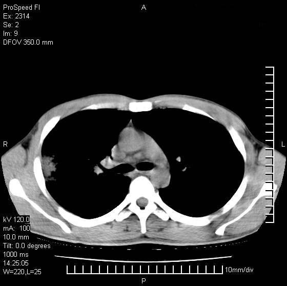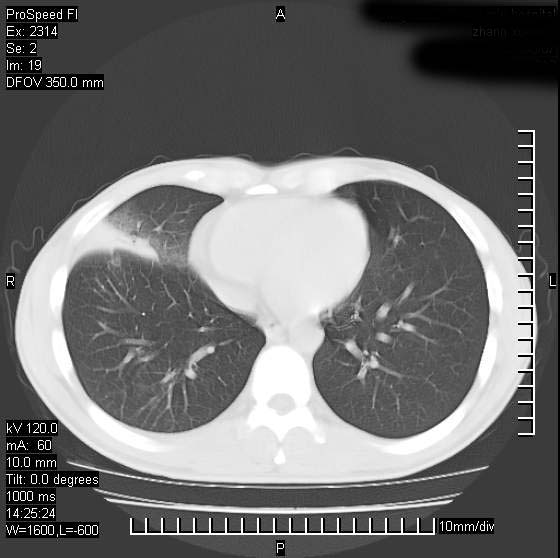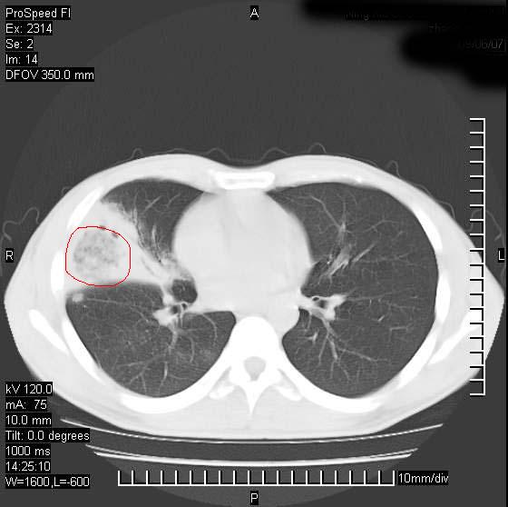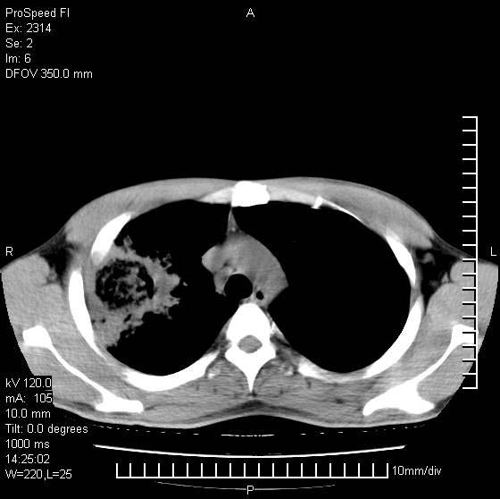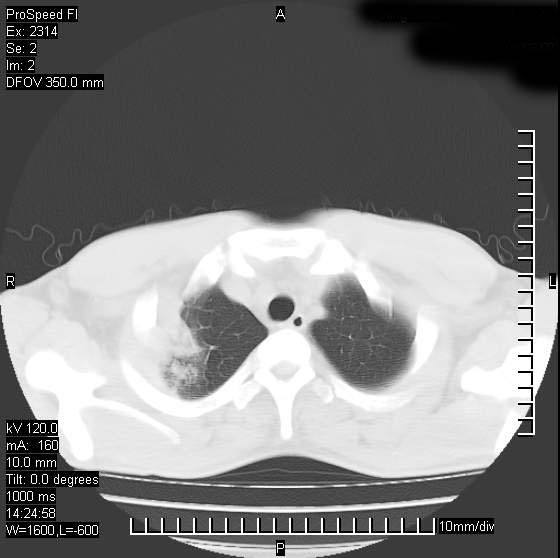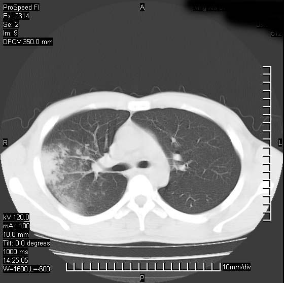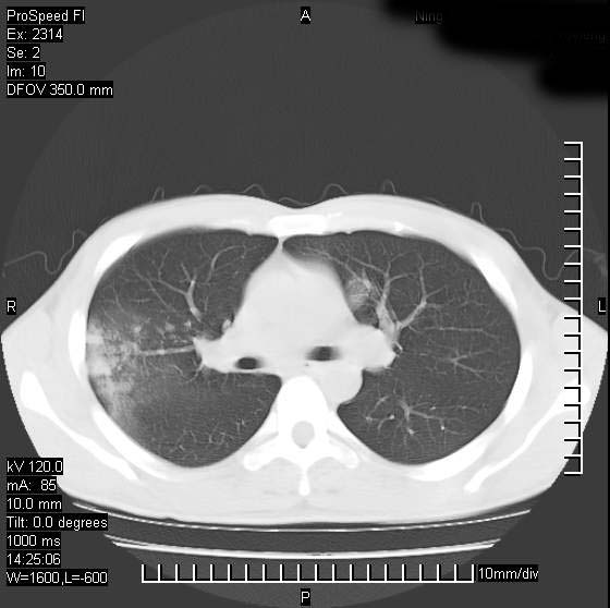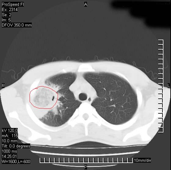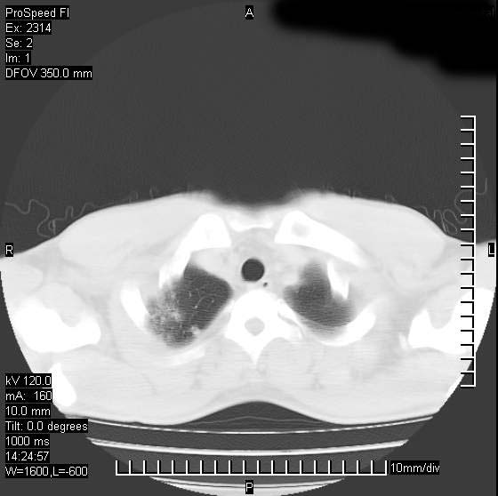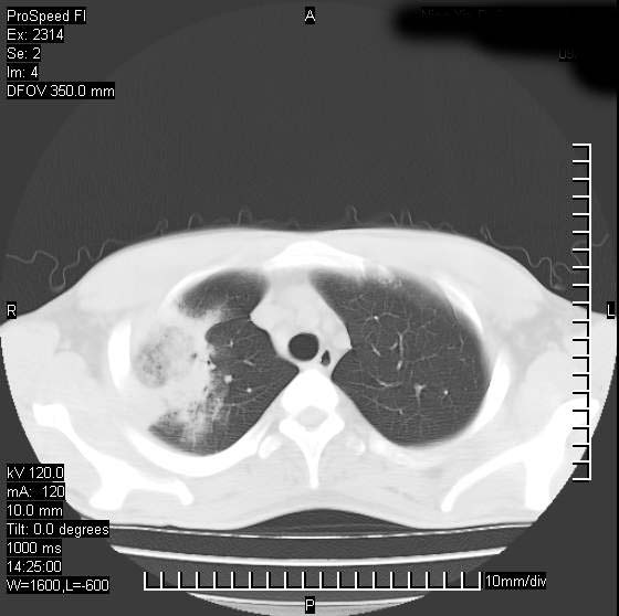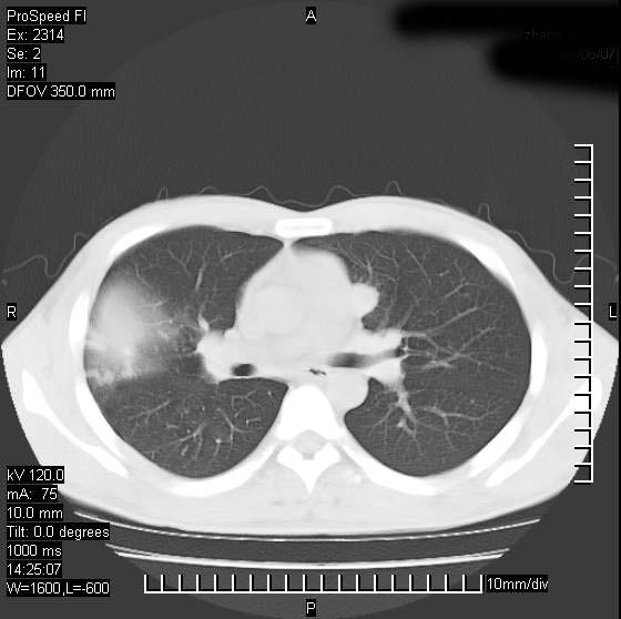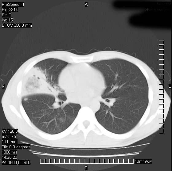男性,再生障碍性贫血,入院前发热10天,最高40c,右侧胸痛,外院ct示右上,中肺边缘模糊的球性影(就是我现在图中标示的范围),考虑炎症,在我院使用头孢呋辛,洛美沙星10天,高烧消退,自感下午稍有发热,但今天ct示右上,中肺病灶明显扩大,还是考虑炎症,看其中的球型影是否霉菌感染??,是否能排除结核?
