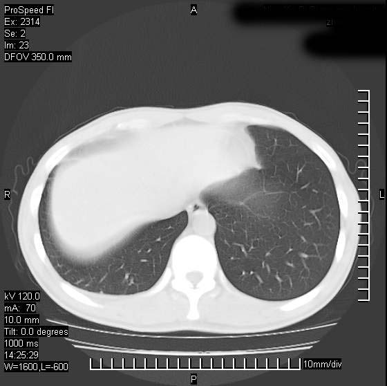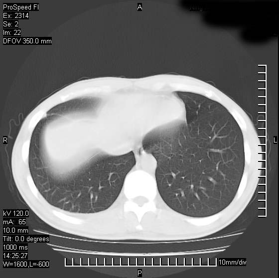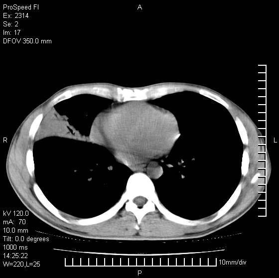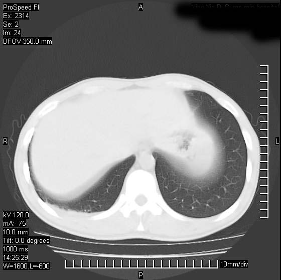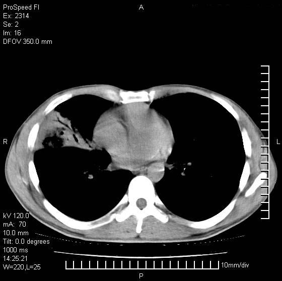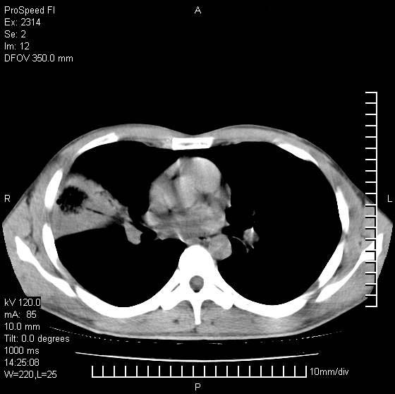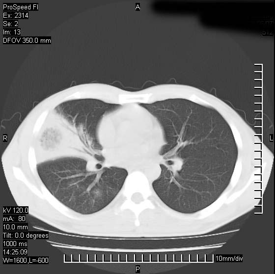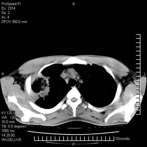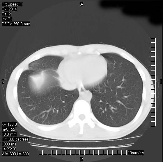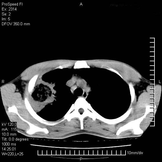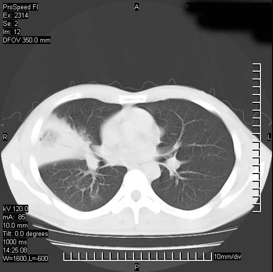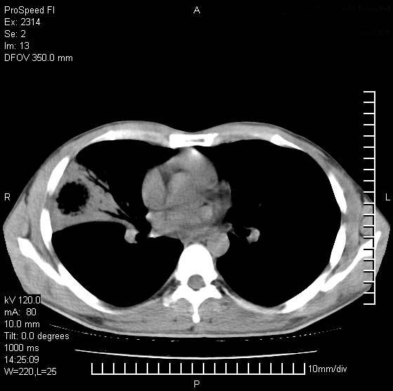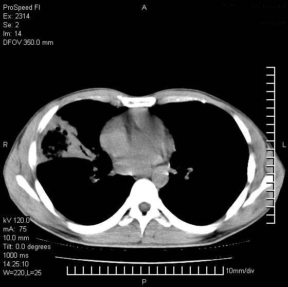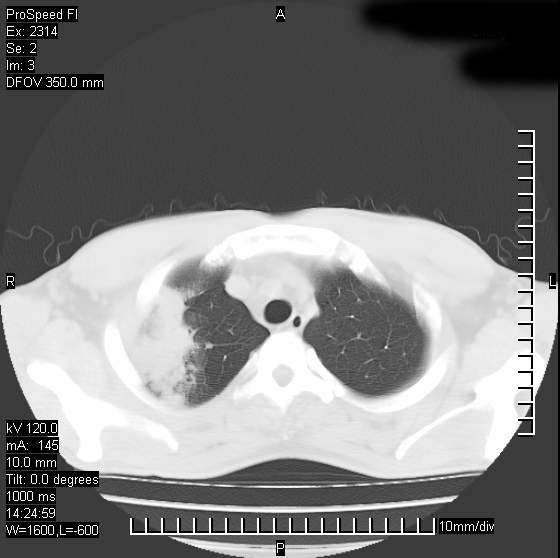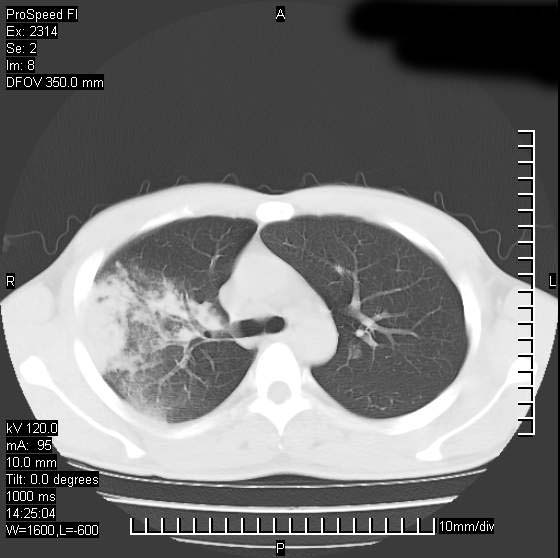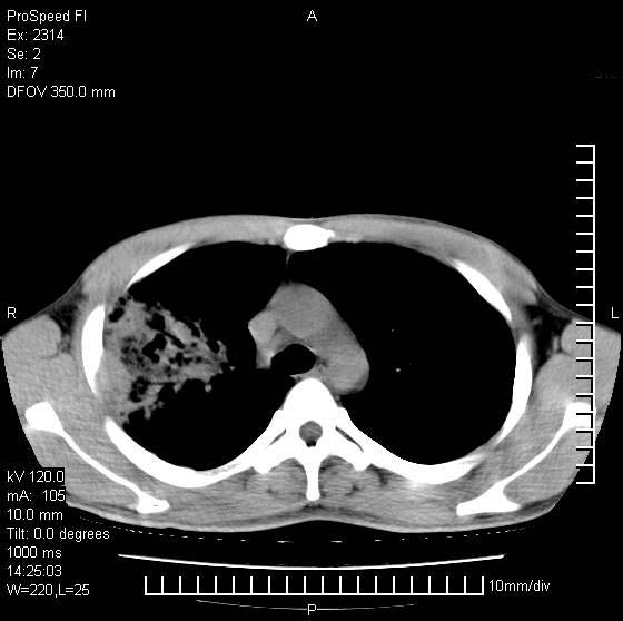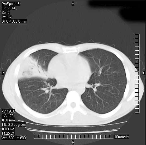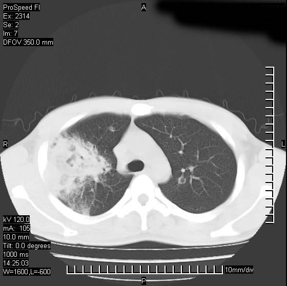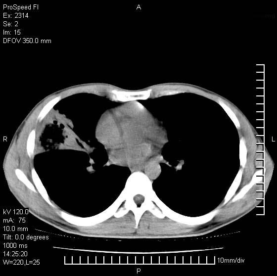 右肺中叶外侧段病变,上缘界限不清,下缘锐利,以段性发病为主,内见巨大空洞及空洞内容物,结合病史首先考虑:化脓性肺炎。不除外霉菌感染!