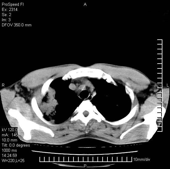 支持右肺上叶、中叶外侧段节段性肺炎伴脓肿形成。