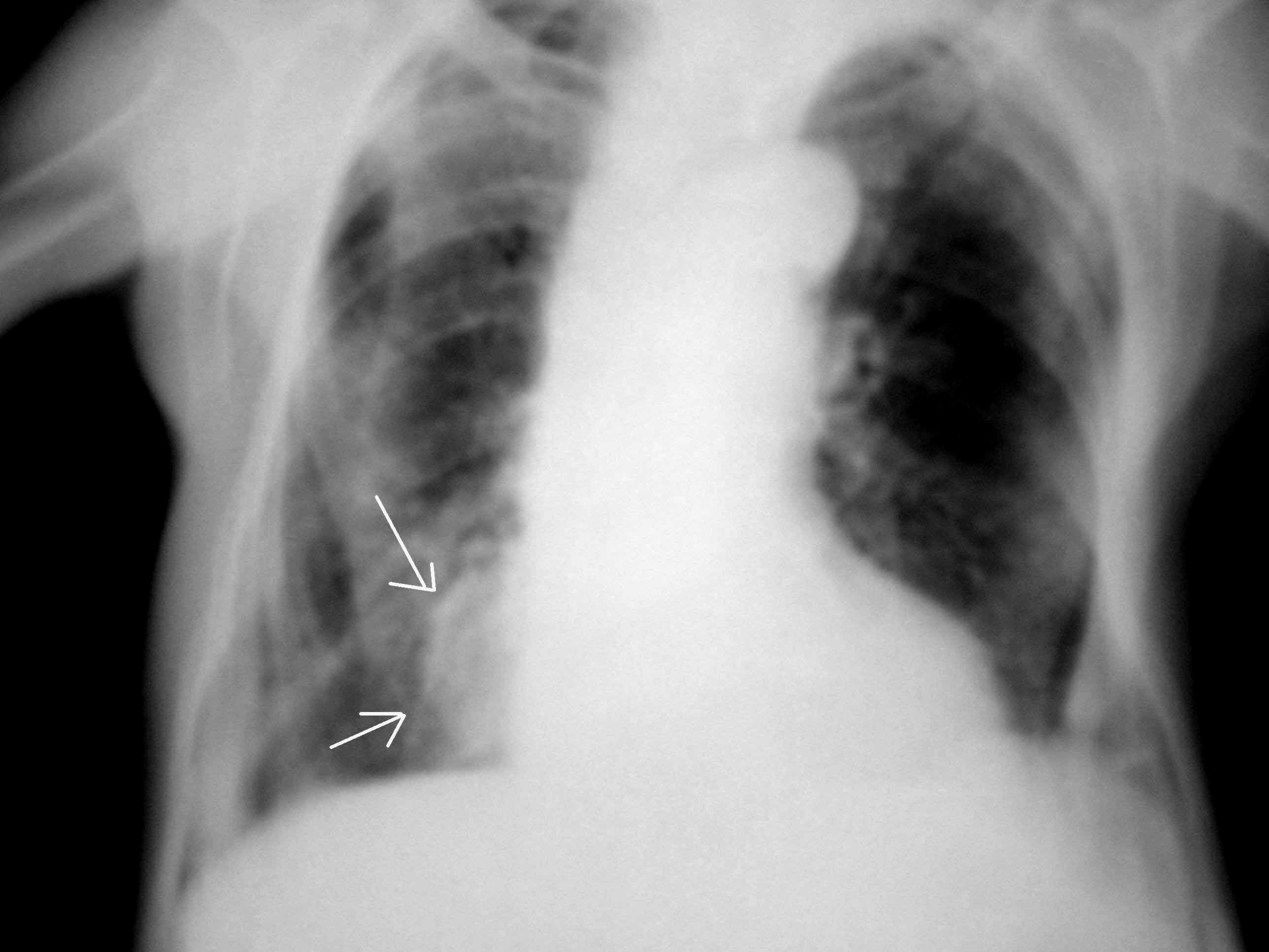 男,60岁,胸痛一周。箭头所示是右心还是异常影?是病变的话会是什么?透视机坏了观察不了搏动情况,我建议病人加照侧位但还没过来照。请各位帮忙看看,谢谢。