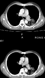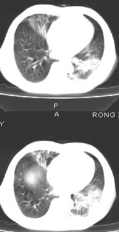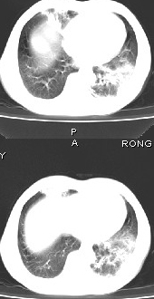 该患者在25天前外圆平片见右肺中上肺野大片状影,(治疗不祥,在反复问病史后患者告诉;近一月住在新房内,搞装修),我认为首先考虑是感染,而且过敏性肺炎可能性大。