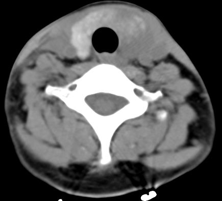 左侧甲状腺弥满性增大,其内密度均匀减低,气管无受压。周围结构清晰。考虑甲状腺炎可能性大。
