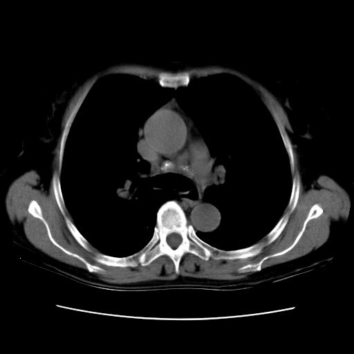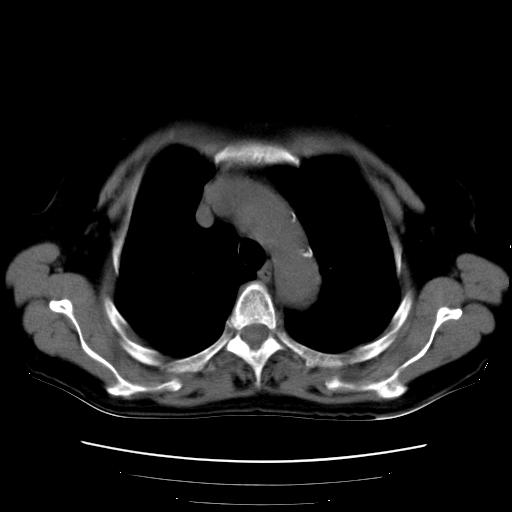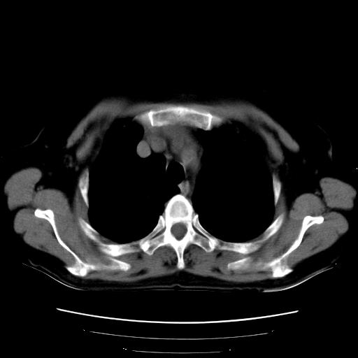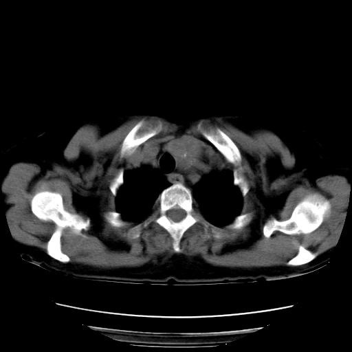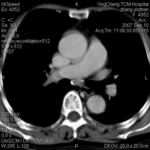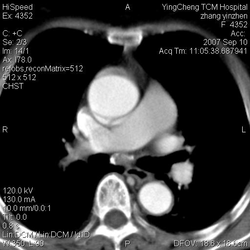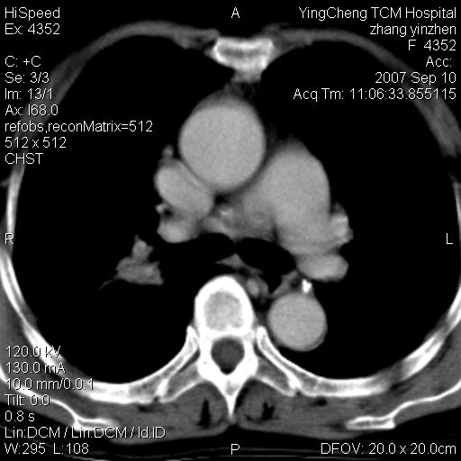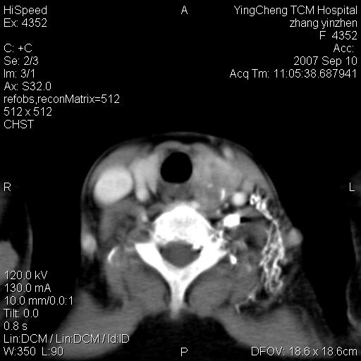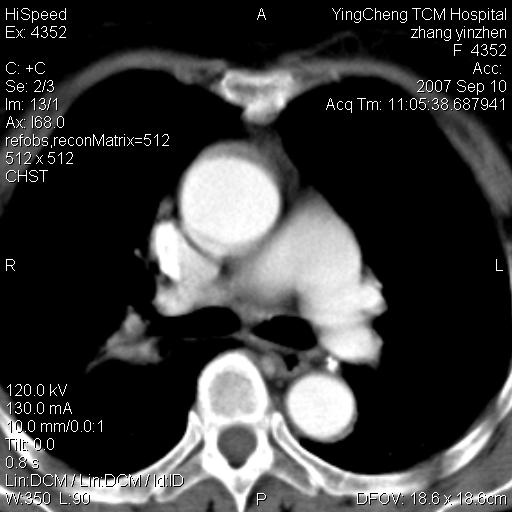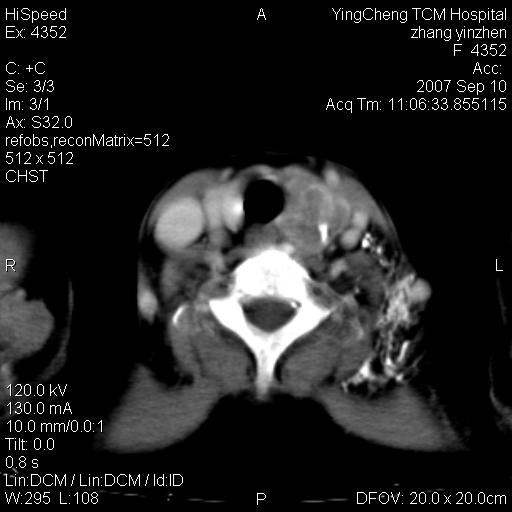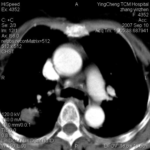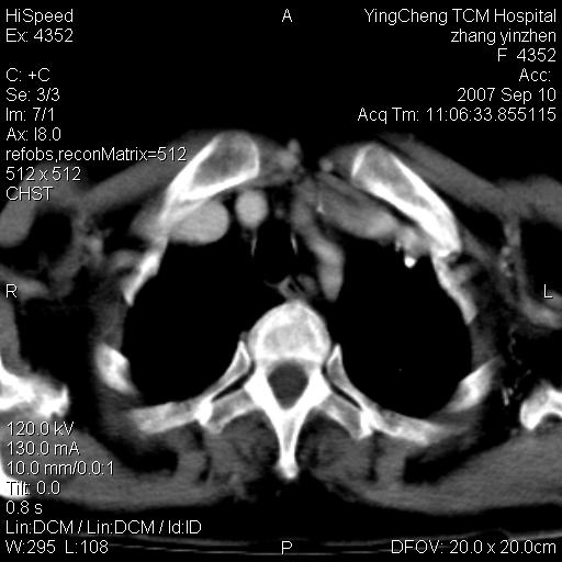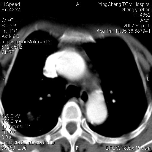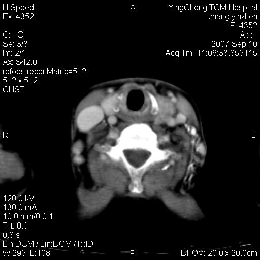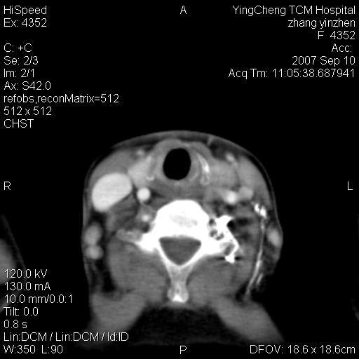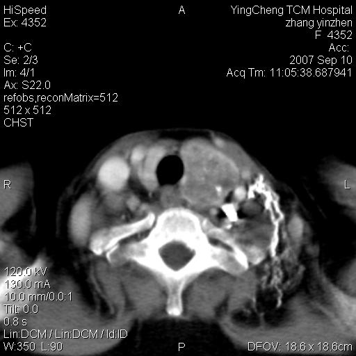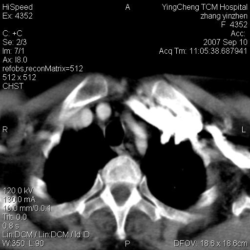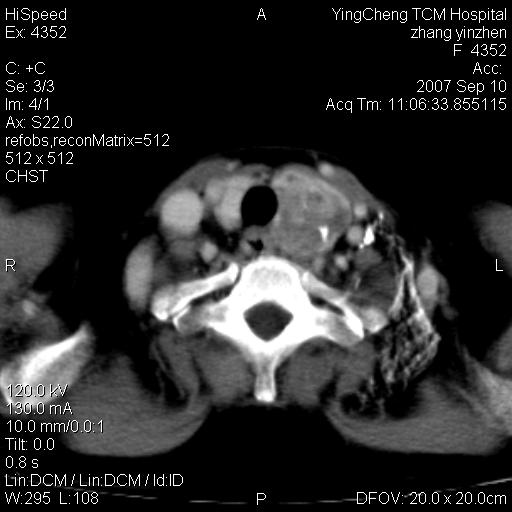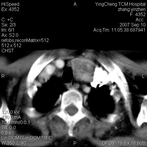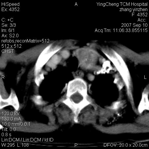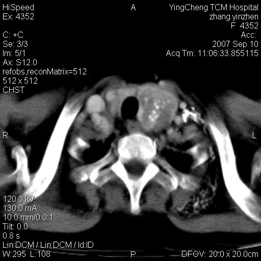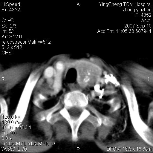 以下是引用卜一在2007-9-18 14:41:00的发言:[br]右肺肿块:毛刺+胸膜凹陷征+供血血管+浅分叶+强化。支持:周围性肺癌 !另:左侧甲状腺腺瘤!